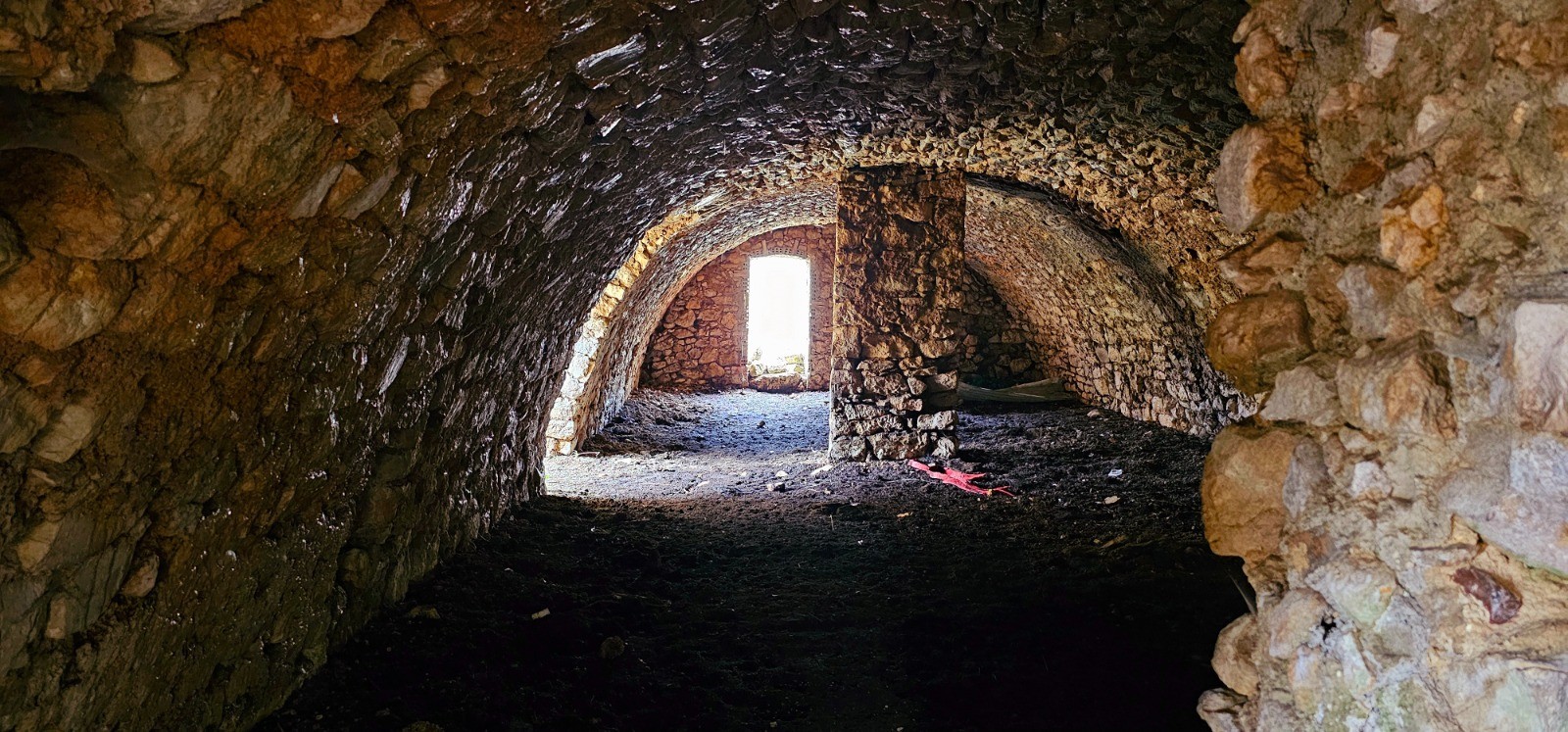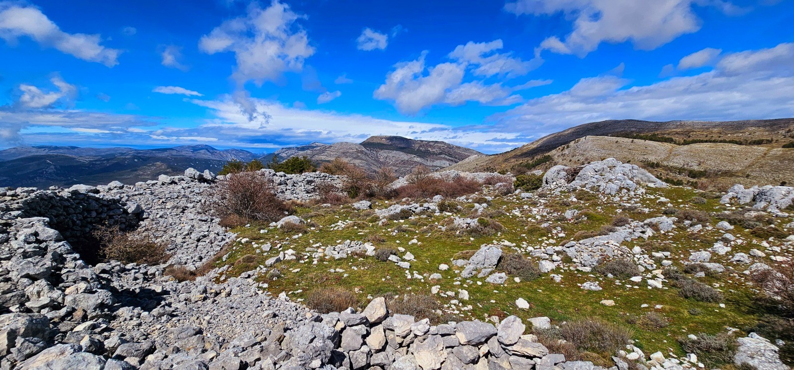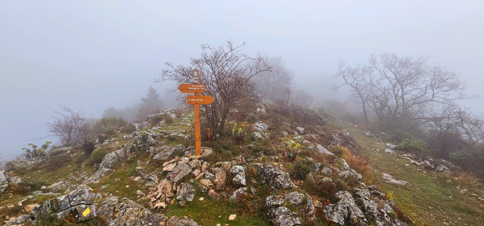 Emprunter le chemin débutant à hauteur du pylône du col et se diriger vers l'est en délaissant la 1ère bifurcation à droite (chemin de retour). Intersection en patte-d'oie 110 m plus loin. Prendre la sente située à votre gauche qui va sinuer sur ligne de crête jusqu'à la balise 64 en passant par les points côtés 998 et 1027. Beau panorama avec sentier que j'ai parcouru par une brume matinale très dense dans une ambiance magique et spectaculaire. Depuis bifurcation balise 64, poursuivre toujours plein est en suivant les points hauts qui jalonnent ce cheminement en crête jusqu'au point côté 1092 (Le Mortier) à partir duquel on amorce une agréable descente jusqu'au col du Ferrier (balise 61). 1ère portion de cet itinéraire par belle sente "cairnée" avec alternance marquage jaune, exigeant sens aigu de l'orientation. Phase ascensionnelle modérée du col du Ferrier au Castellaras de la Malle (2,55 km pour d+ 174 m) par sentier bien marqué longeant plusieurs bories et vestige d'abri ligure. Traversée d'un bois de pins sylvestres avant de découvrir le Castellaras et ses caractéristiques remarquables : enceinte en arc de cercle sur à-pic avec mur de soutènement sur rempart de 4 m de large pour 5 m hauteur maximale, pour surface de 108 m de long et 31 m de large avec 2 portes d'accès au nord et au sud contre l'à-pic.