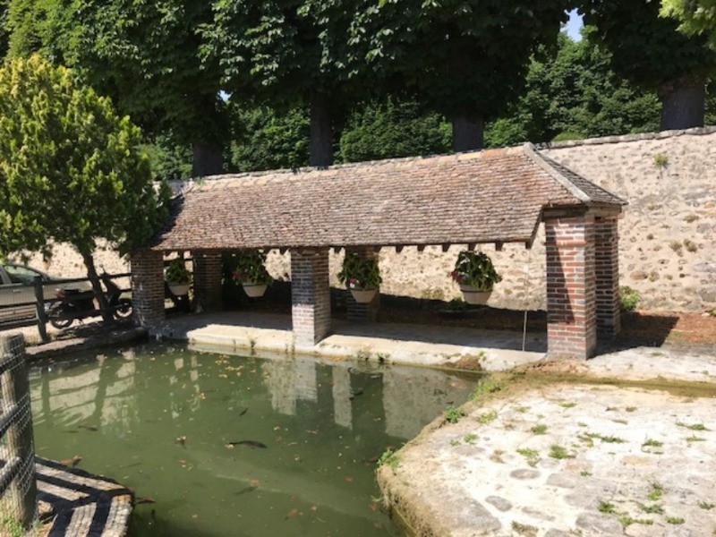 Reprendre à gauche la rue de la Croix Neuve et après quelques mètres à droite le chemin du Cormier. Laisser à gauche la sente de Barbeau et prendre à droite, entre champ et bois, le chemin de l’Hôpital. Au bout de ce chemin, tourner à droite et traverser la rue de l’Hôpital pour prendre, sur la rue du Chemin Blanc, le petit chemin « le Sentier des Fontaines » jusqu’aux marches. Tourner à gauche rue de la Fontaine du Sault jusqu’au lavoir. Voir les inscriptions du fronton. Prendre à droite après le lavoir la rue des Sources pendant 180m.