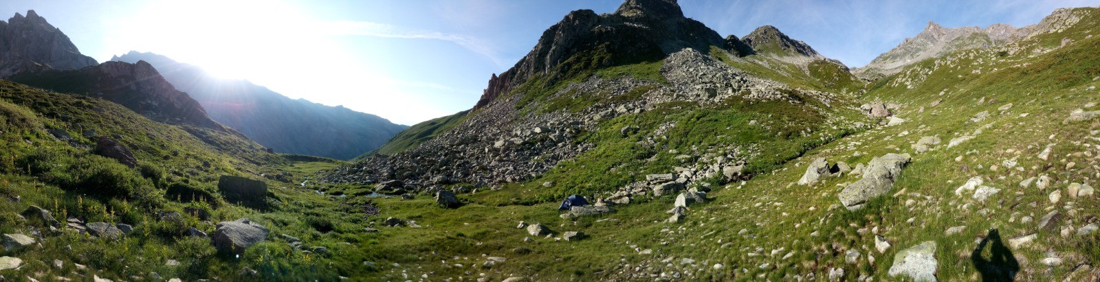 Un peu plus haut, dans le vallon du torrent Ormente, nous avons trouvé une petite-plate forme herbeuse pour planter une tente (voir la trace), mais son accès n'est pas très aisé : par le bas, c'est une zone humide, par le haut c'est raide et végétalisé.
