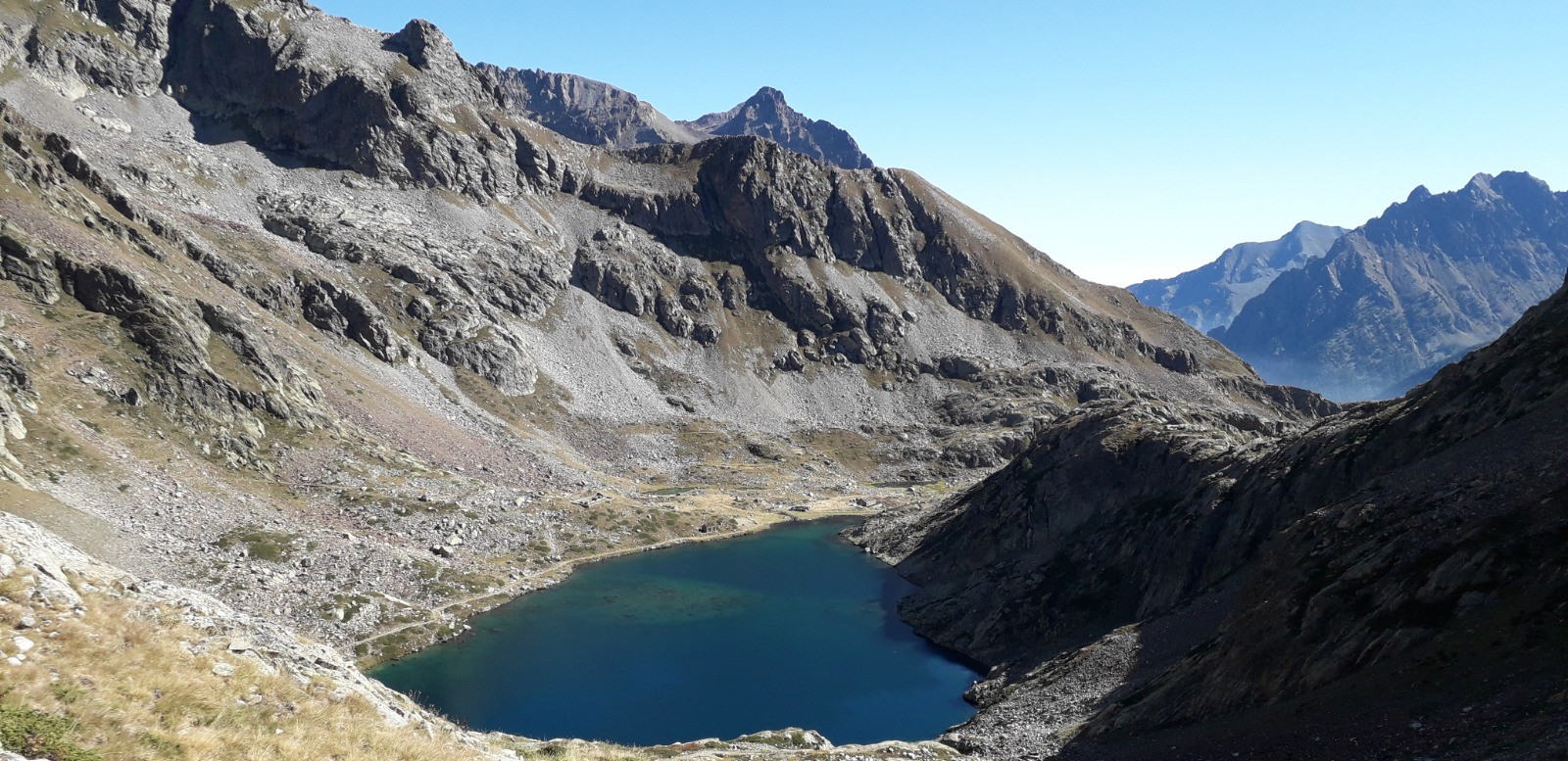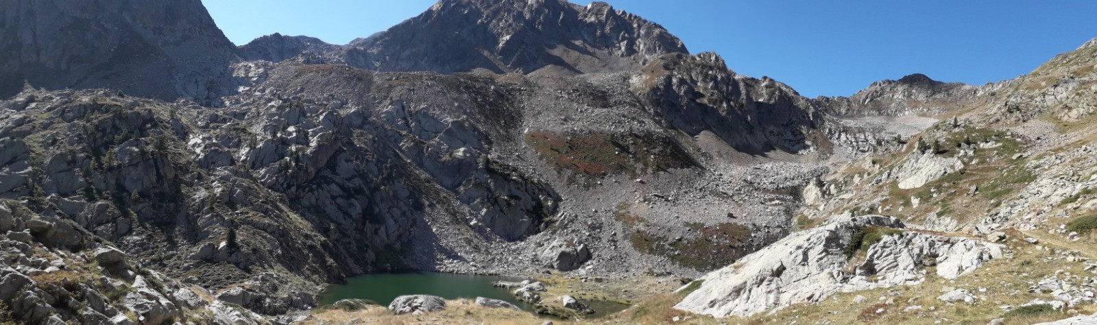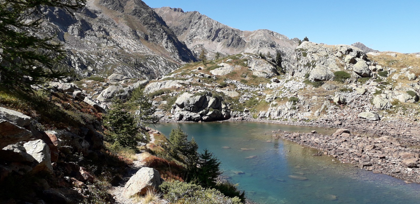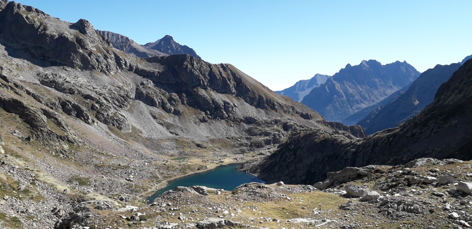 Circuit réalisé le 05/09/20. Belle balade nécessitant une bonne condition physique. Il s'agit d'un long parcours avec une succession de montées prononcées. Ascension classique au départ du chalet Diva/Marano (Isola 2000) jusqu'au col frontalier de Druos (2628 m) qui offre une perspective admirable sur la vallée des lacs de Terre Rouge et sur celle des 4 lacs de Valscura en Italie. Après la montée jusqu'au col de Valscura (2520 m) dans un univers minéral, on amorce la descente vers le lac de Malinvern (2122 m) et de Paur situé au-dessus. J'ai choisi de bivouaquer au bord du 1er à mi-parcours. Présence de chamois à proximité de la cascade qui s'y déverse depuis un petit lac supérieur. Beau coucher de soleil se reflétant sur le lac qui prend des teintes ambrées. Aucune autre présence humaine ce soir-là.La balade se poursuit avec une descente à fort dénivelé jusqu'au refuge de Malinvern (1839 m). Débute alors pour ma part la partie la plus belle de la rando jusqu'aux 2 lacs d'Orgials (2292 m) en empruntant la Via Alpina qui mérite bien son nom et qui longe des lacs d'altitude avec alpage, dans un secteur boisé. On renoue au-delà avec des reliefs alpins austères jusqu'à la cime de la Lombarde (2800 m), soit un dénivelé de près de 1000 m au départ du refuge, qui se prolonge jusqu'à la cime de Vermeil (2778 m) qui n'est pas spectaculaire en soi mais qui offre bien évidemment un beau point de vue sur les 2 versants frontaliers. On amorce aussitôt une autre grande descente sur des pistes caillouteuses avant d'entamer une nouvelle montée dans un univers quasi hostile d'éboulis rocheux. Praticabilité pouvant s'avérer difficile pour un chien même aguerri comme c'était le cas pour le mien. On parvient enfin au Pas du Loup (2665 m) pour basculer abruptement en France vers les lacs de Terre Rouge.
