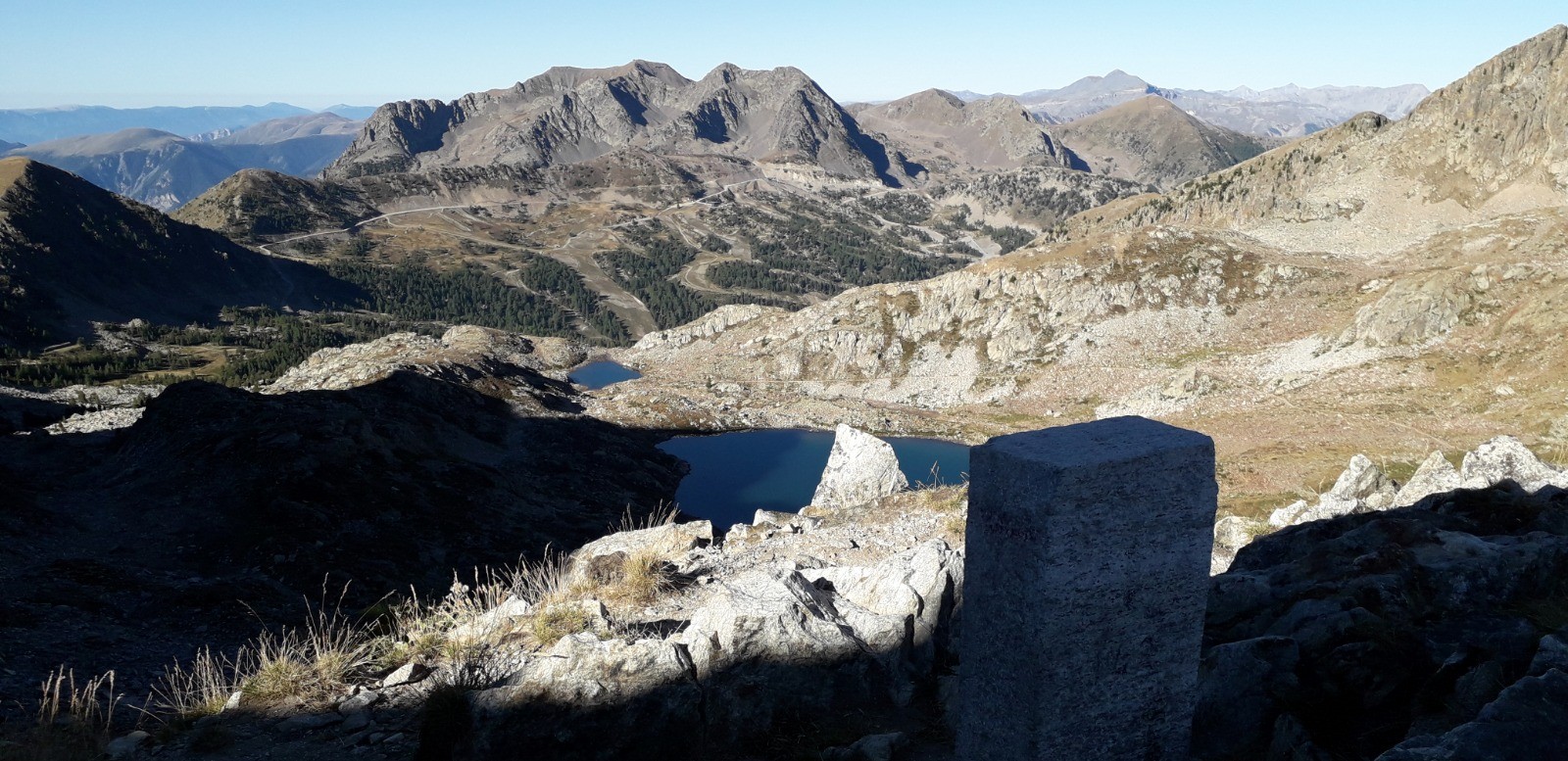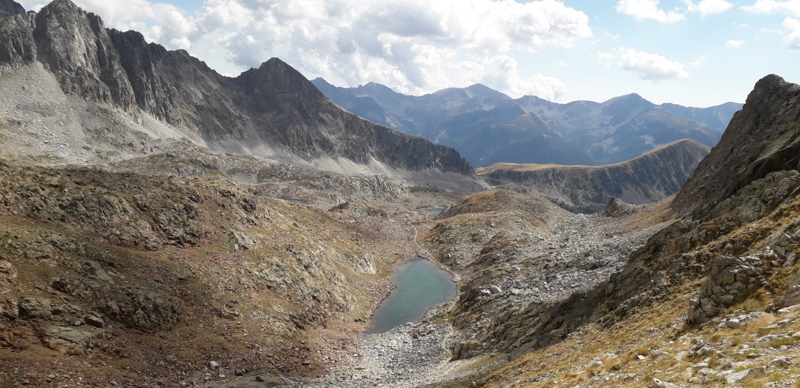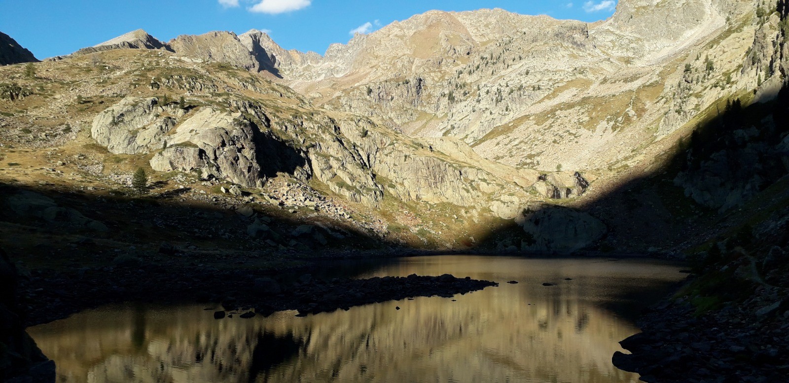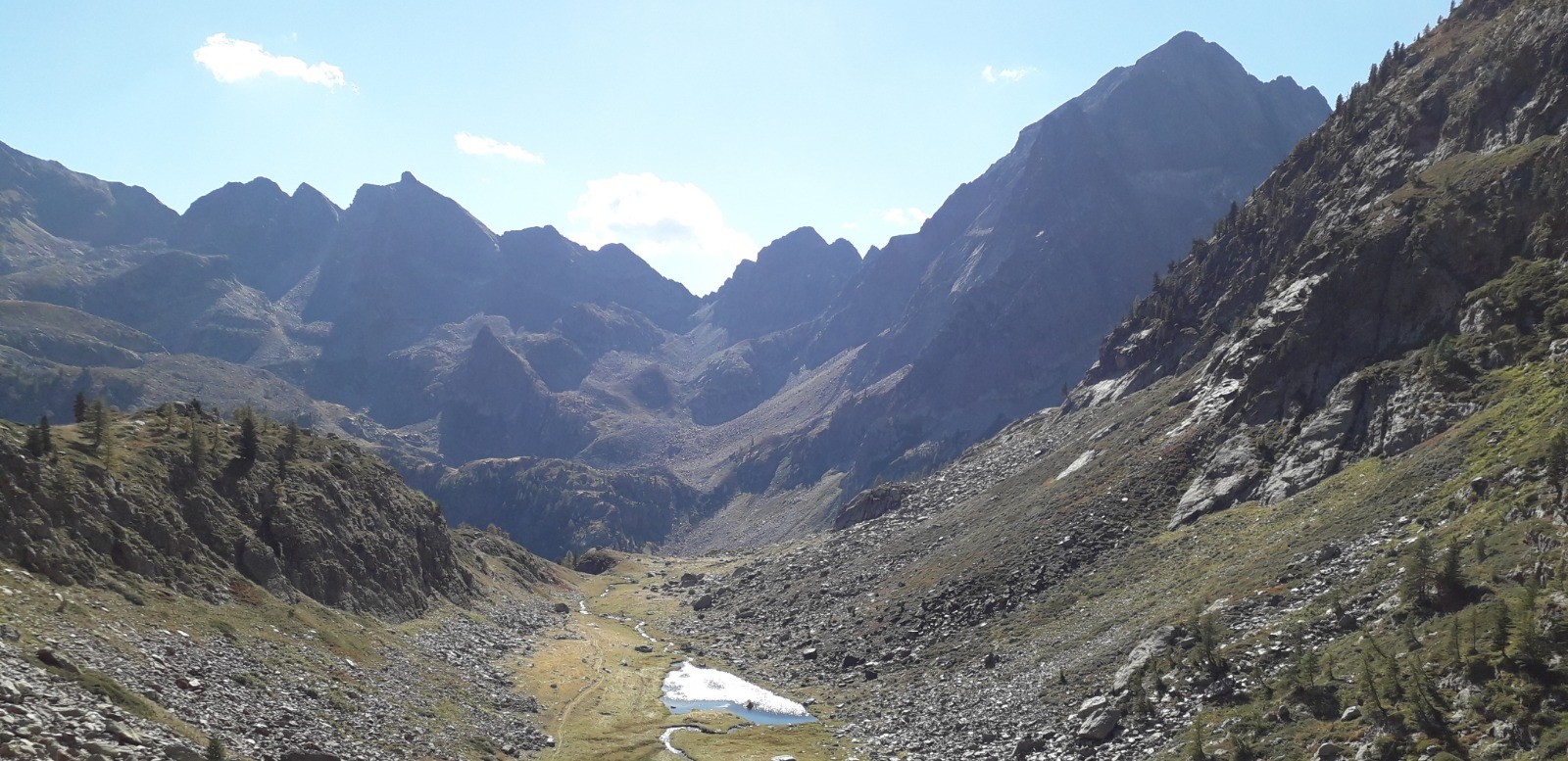 Circuit réalisé le 05/09/20. Belle balade nécessitant une bonne condition physique. Il s'agit d'un long parcours avec une succession de montées prononcées. Ascension classique au départ du chalet Diva/Marano (Isola 2000) jusqu'au col frontalier de Druos (2628 m) qui offre une perspective admirable sur la vallée des lacs de Terre Rouge et sur celle des 4 lacs de Valscura en Italie. Après la montée jusqu'au col de Valscura (2520 m) dans un univers minéral, on amorce la descente vers le lac de Malinvern (2122 m) et de Paur situé au-dessus. J'ai choisi de bivouaquer au bord du 1er à mi-parcours. Présence de chamois à proximité de la cascade qui s'y déverse depuis un petit lac supérieur. Beau coucher de soleil se reflétant sur le lac qui prend des teintes ambrées. Aucune autre présence humaine ce soir-là.La balade se poursuit avec une descente à fort dénivelé jusqu'au refuge de Malinvern (1839 m). Débute alors pour ma part la partie la plus belle de la rando jusqu'aux 2 lacs d'Orgials (2292 m) en empruntant la Via Alpina qui mérite bien son nom et qui longe des lacs d'altitude avec alpage, dans un secteur boisé. On renoue au-delà avec des reliefs alpins austères jusqu'à la cime de la Lombarde (2800 m), soit un dénivelé de près de 1000 m au départ du refuge, qui se prolonge jusqu'à la cime de Vermeil (2778 m) qui n'est pas spectaculaire en soi mais qui offre bien évidemment un beau point de vue sur les 2 versants frontaliers. On amorce aussitôt une autre grande descente sur des pistes caillouteuses avant d'entamer une nouvelle montée dans un univers quasi hostile d'éboulis rocheux. Praticabilité pouvant s'avérer difficile pour un chien même aguerri comme c'était le cas pour le mien. On parvient enfin au Pas du Loup (2665 m) pour basculer abruptement en France vers les lacs de Terre Rouge.