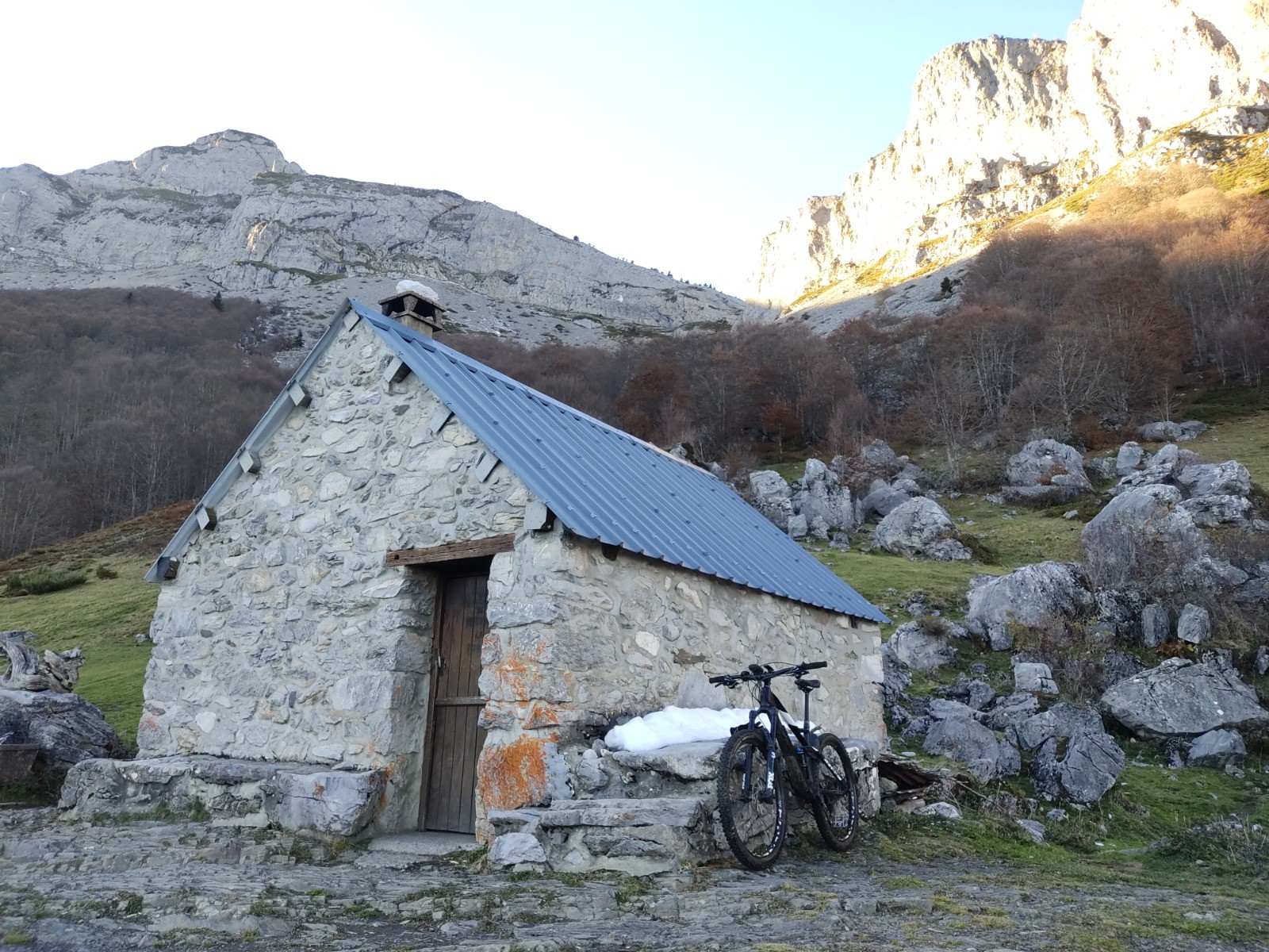 Départ de lées-Athas à côté d'un ancien lavoir pour aller chercher la N134 et remonter vers Lescun au plus tôt. Au dessus de Lescun, le panorama s'ouvre sur le secteur du Pic d'Anie avec le Billare et la crête du Countendé. Une bonne grimpette sur la route que l'on quitte juste en dessous du refuge de Labérouat, ça pique bien sur les derniers kilomètres mais on en prend plein les mirettes.Ensuite, une traversée mi-roulante mi-portage avant d'attaquer une première descente qui mène à une clairière où on traverse un petit ruisseau, 20 m après, on a le choix de remonter à gauche vers la cabane du Boué (cette trace) ou de partir à droite en descente plus directe dans la forêt (balisage VTT). L'option de la cabane permet d'y faire une pause avec un superbe panorama avant de prendre une traversée descendante en dessous du bois de Légna qui rejoint une jolie crête bien raide. Le reste est plus facile mais moins amusant, en mode "lacher de frein".