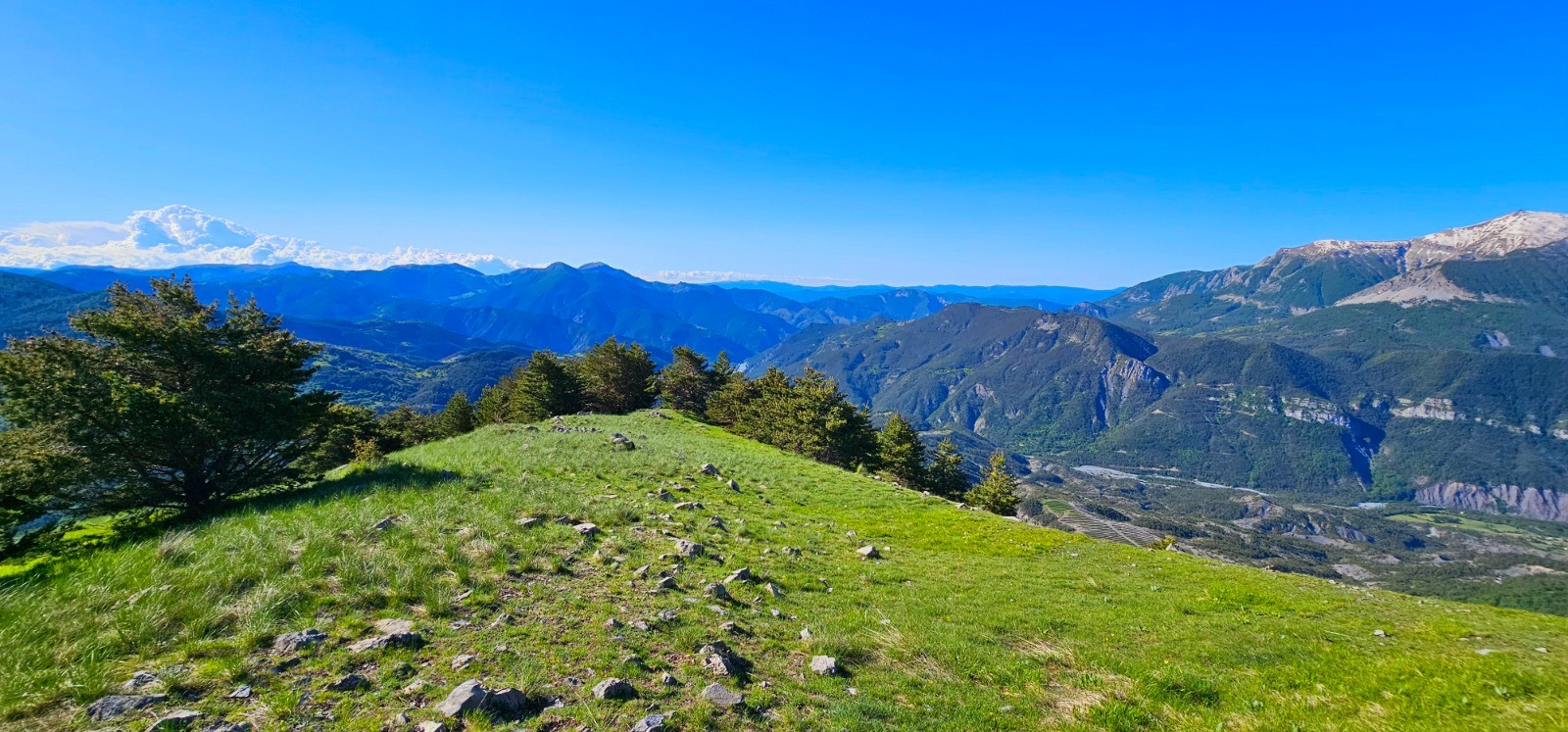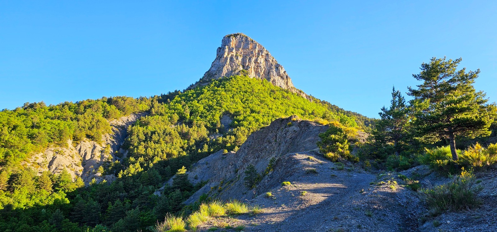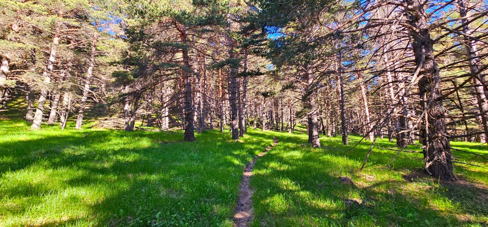 Prendre plein nord jusqu'à la balise 200 de la chapelle Saint-Antoine et emprunter le GR 52 A à la patte d'oie constituée avec la route menant au village des Tourrès. Montée constante jusqu'à la B 202 a (borne ne figurant pas sur carte IGN) par côtes dénudées de marne noire avant d'aborder une magnifique zone boisée de pins sylvestres. Ascension plus rude après la B 199 où l'on délaisse le GR pour accéder aux belles prairies d'alpage de la B 202 a qui constituent le point culminant de cette rando. Suivre au sud le cheminement indiqué en pente douce vers le collet de Sen qui se prolonge en proue de navire vers l'à-pic impressionnant du bastion calcaire de Chanabasse avec une vue majestueuse sur le bassin de Guillaumes et les principales cimes du Haut-Var, notamment le mont Saint-Honorat.