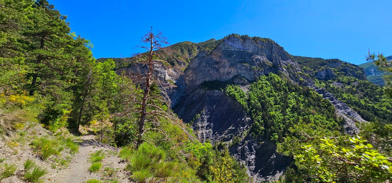 Trace conçue pour étoffer le parcours classique dit du "Moulin de la Barlatte" en réalisant 2 extensions en A/R qui s'insèrent parfaitement dans le thème de cette sortie avec 2 centres d'intérêt majeur constitués par la cime de Chanabasse et les gorges de Saucha négra. Baou majestueux pour le 1er, qui domine de manière spectaculaire le village de Châteauneuf-d'Entraunes avec biotope préservé permettant l'observation privilégiée d'une faune remarquable (aigles royaux, faucons éperviers et hirondelles des rochers) avec panorama grandiose sur la vallée du Var et vue d'ensemble sur les Barres du Cougnet et les gorges de Saucha Négra qui alimentaient le Moulin de la Barlatte. Magnifiques gorges avec une 2nde extension amplement justifiée le long du torrent impétueux de la Barlatte, menant à une superbe cascade de plus de 100 m de haut parfaitement accessible par sentier. Retour avec alternance de belles zones boisées et de reliefs caractéristiques de marne noire. Point haut du parcours à 1829 m depuis balise "202 a" précédant le collet de Sen.