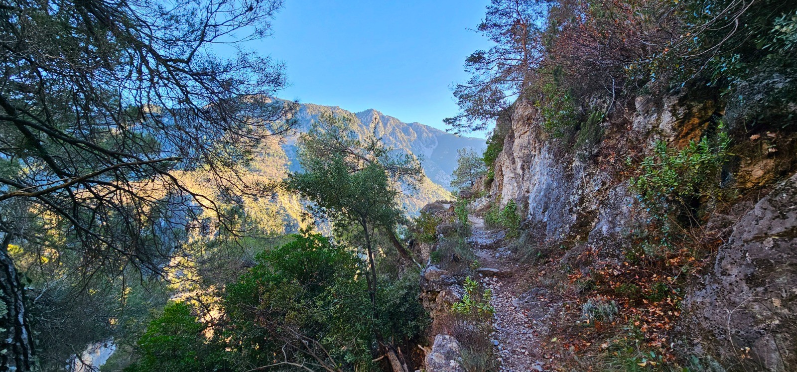 Après avoir rejoint le col d'Ambellarte, prendre plein est par PR bien signalisé et rejoindre le GR 5 à la balise 6. Le suivre jusqu'à la B 4 précédant l'arrivée au Collet des Moutons. Cette portion du GR est superbe et domine les gorges de la Vésubie par de beaux chemins muletiers avec des points remarquables tel celui de l'émouvante chapelle Saint-Antoine bâtie en 1686 sur un site spectaculaire.