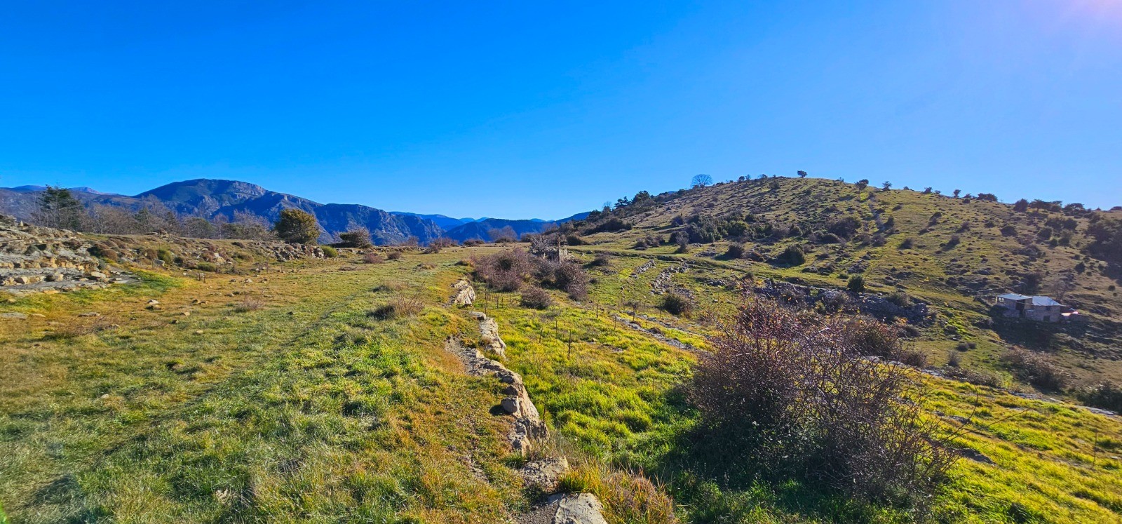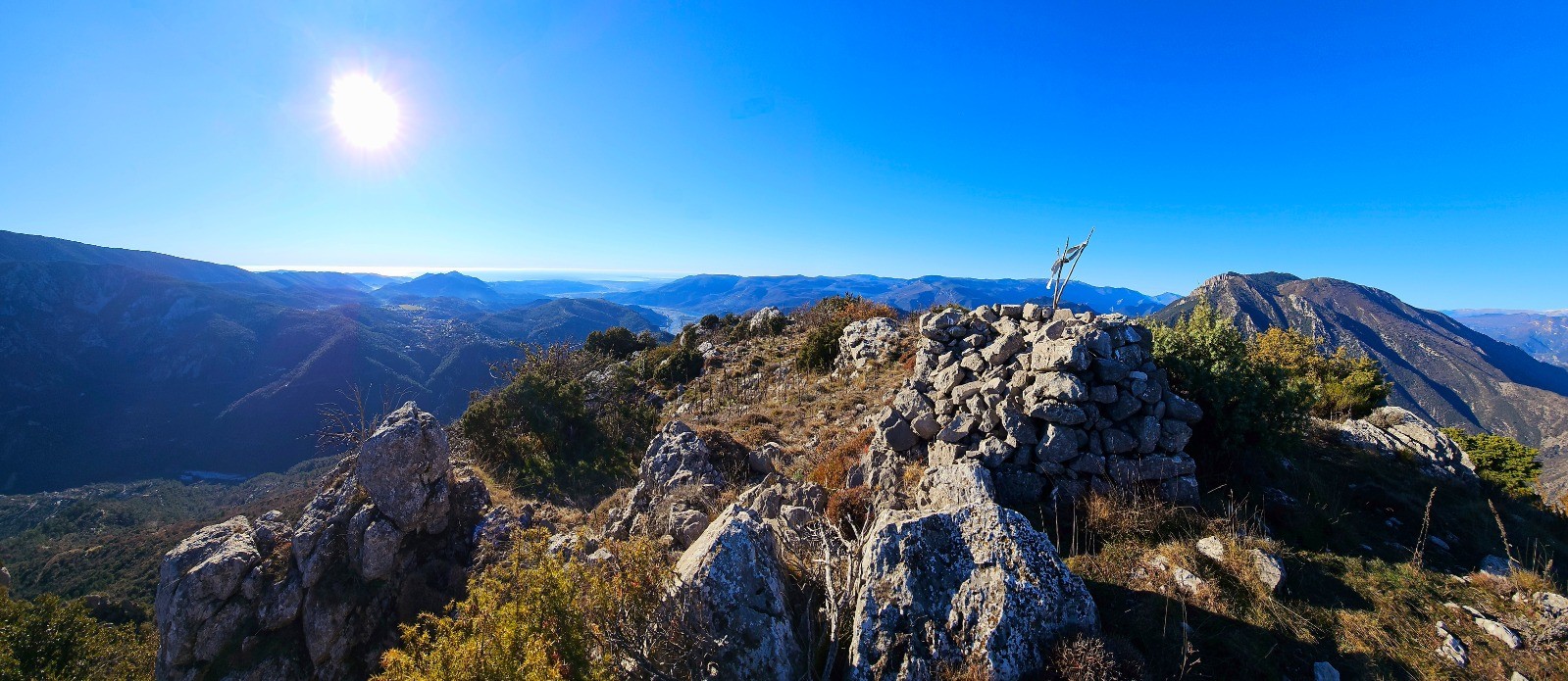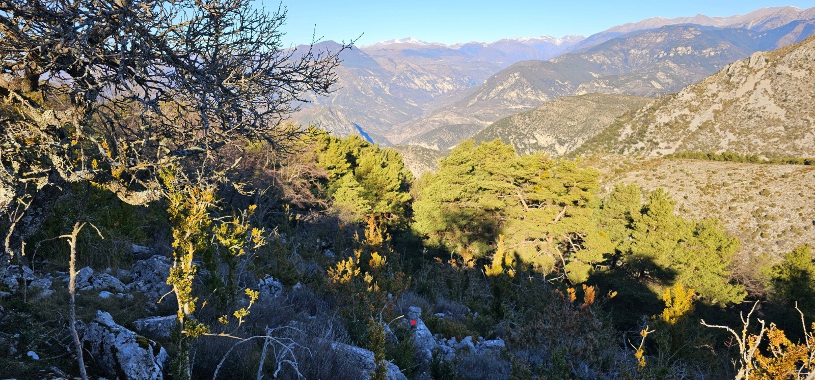 Du cairn sommital, suivre la crête vers l'Est sur 80 m sur sa partie plus ou moins horizontale et descendre au nord par une vague sente amorcée par des cairns (cf. photo N° 7). Poursuivre au mieux à travers la forêt en contournant par la gauche une barre rocheuse signalée sur carte IGN avant de rejoindre une douce crête passant par le point côté 1035 pour faire jonction avec le PR qui avait été abandonné au lieu-dit Villa Plana. Rejoindre dès lors sans encombre le col d'Ambellarte en passant par le beau plateau de la balise 105 (bergerie). Montée plus soutenue depuis le col (d+ 205 m pour 1,12 km) jusqu'à la crête de la Madone par l'adret de la Ragaïssa en suivant un bon marquage jaune sur partie rocheuse. Point de vue exceptionnel sur massifs environnants, notamment sur le Castel Gineste et le Brec d'Utelle en vis à vis immédiat avec une vue magistrale sur la partie littorale.
