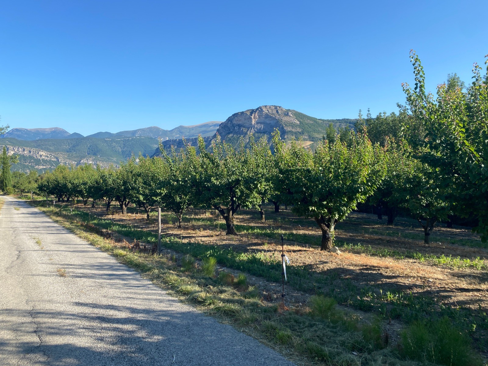 Nous empruntons une petite route bordée de poiriers et d'abricotiers.