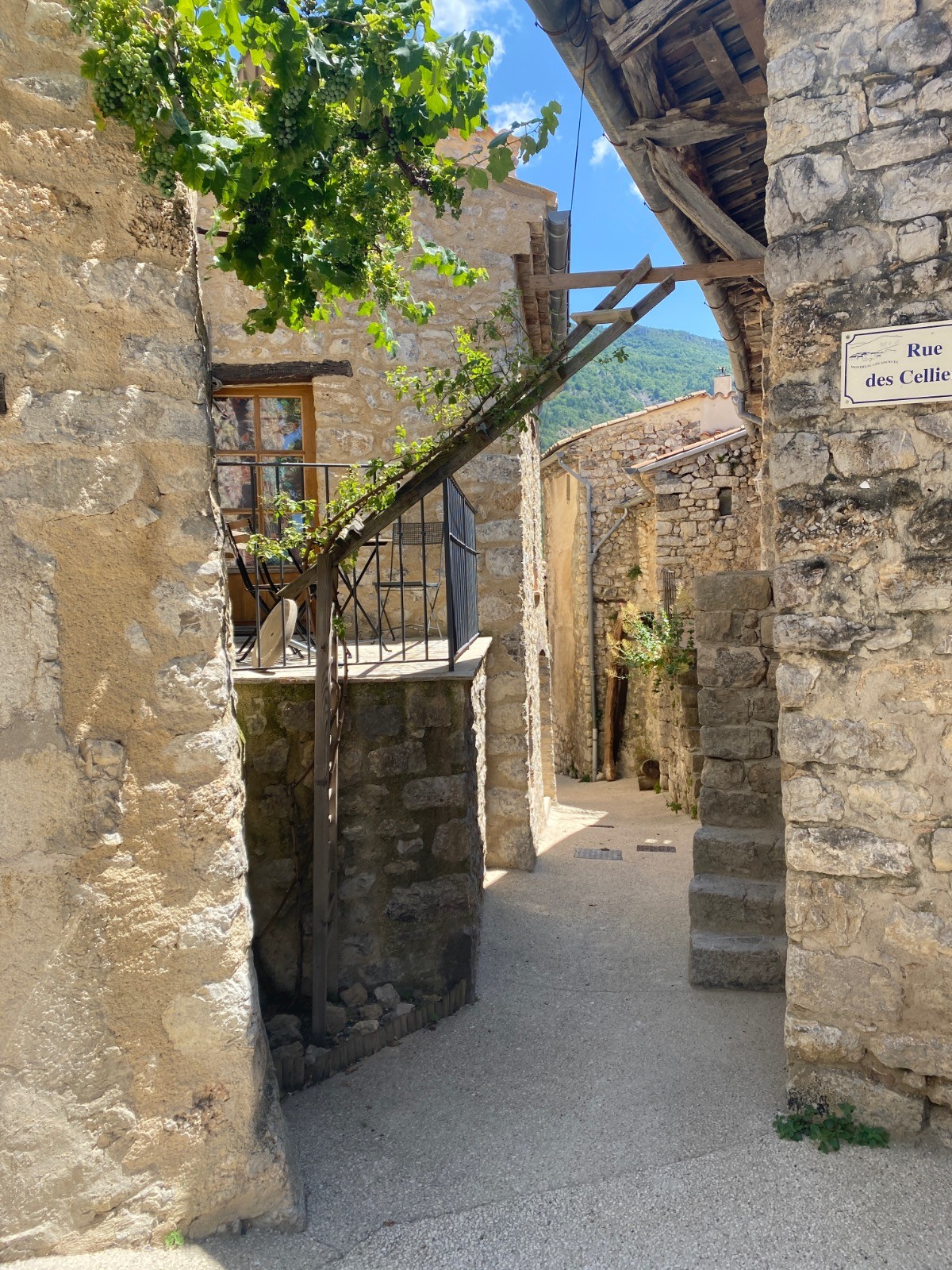Les façades sont ornées de rosiers grimpants en fleurs, les ruelles sont bordées de maisons anciennes aux escaliers extérieurs eux aussi très anciens, avec leurs marches si hautes et pas de rampes, si jolis mais si périlleux.