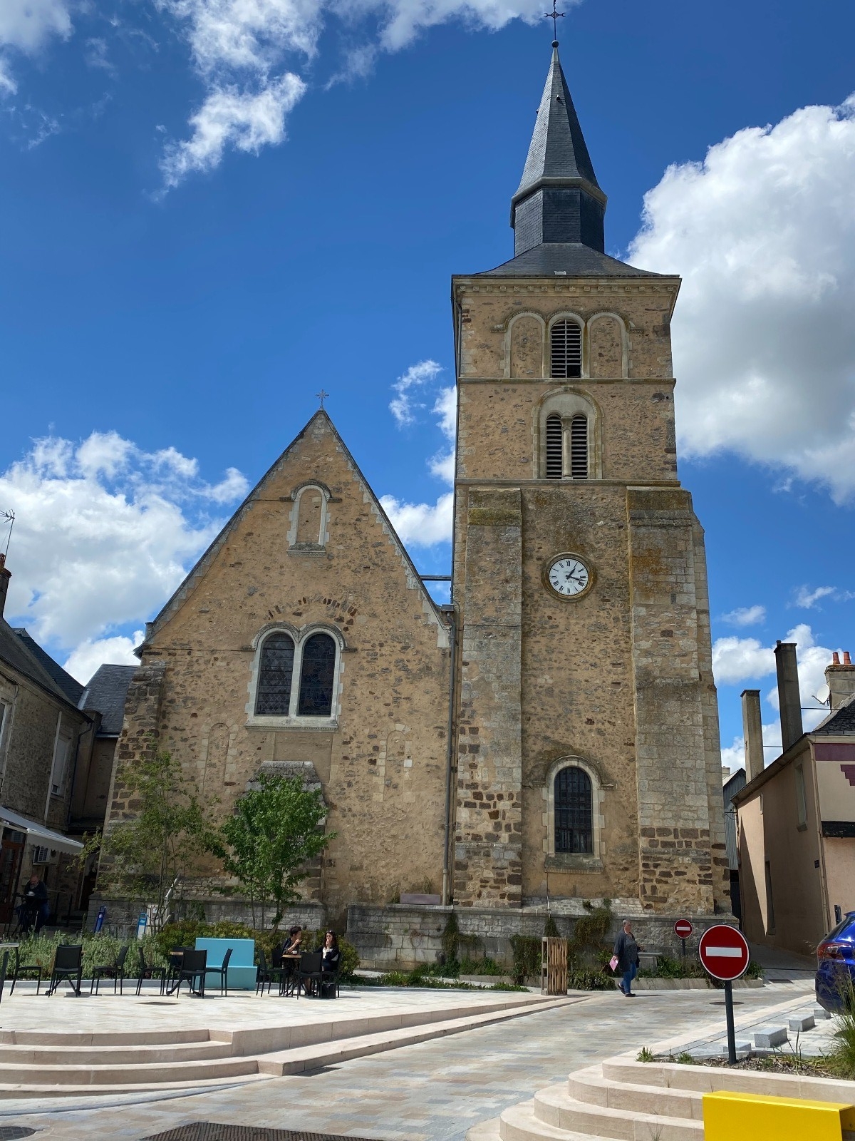 En rejoignant la base aqualudique, vous passerez devant l'hôtel Ricordeau et l'église de Loué (ancienne place du Marché de Loué).