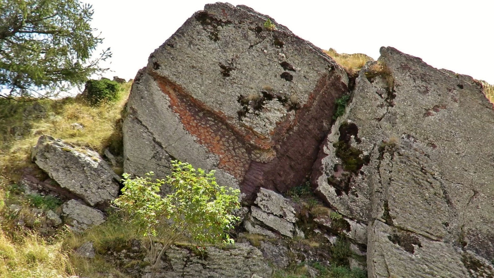 Autre curiosité, si l’envie vous en titille, on n’est qu’à 5 minutes du rocher aux huitres : continuer la crête par une petite sente habituellement cairnée jusqu’à apercevoir un gros rocher sur la droite avec une zone violacée de pélites ponctuée de taches bleu-verdâtres qui ne sont autre que des fossiles de coquillages préhistoriques aux temps où ces terres étaient sous la mer. REGARDEZ, PHOTOGRAPHIEZ, MAIS NE TOUCHEZ PAS !