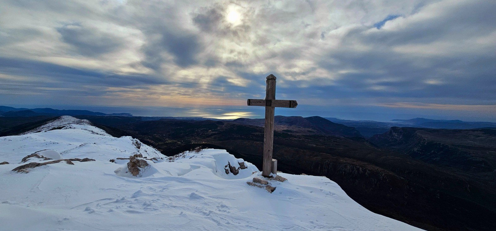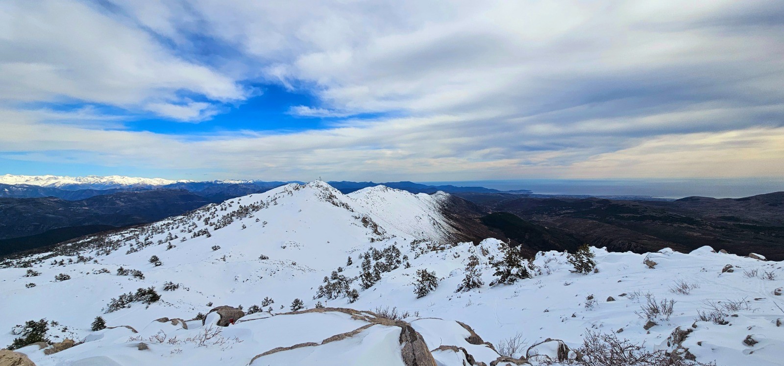 Superbe panorama depuis ce 1er sommet (Croix de Verse) avec crête en pente se poursuivant à l'est vers le Col de Coursegoules et en dents de scie à l'ouest vers la cime du Cheiron. Distance Croix de Verse / Cheiron : 2,95 km avec d+ 211 m.