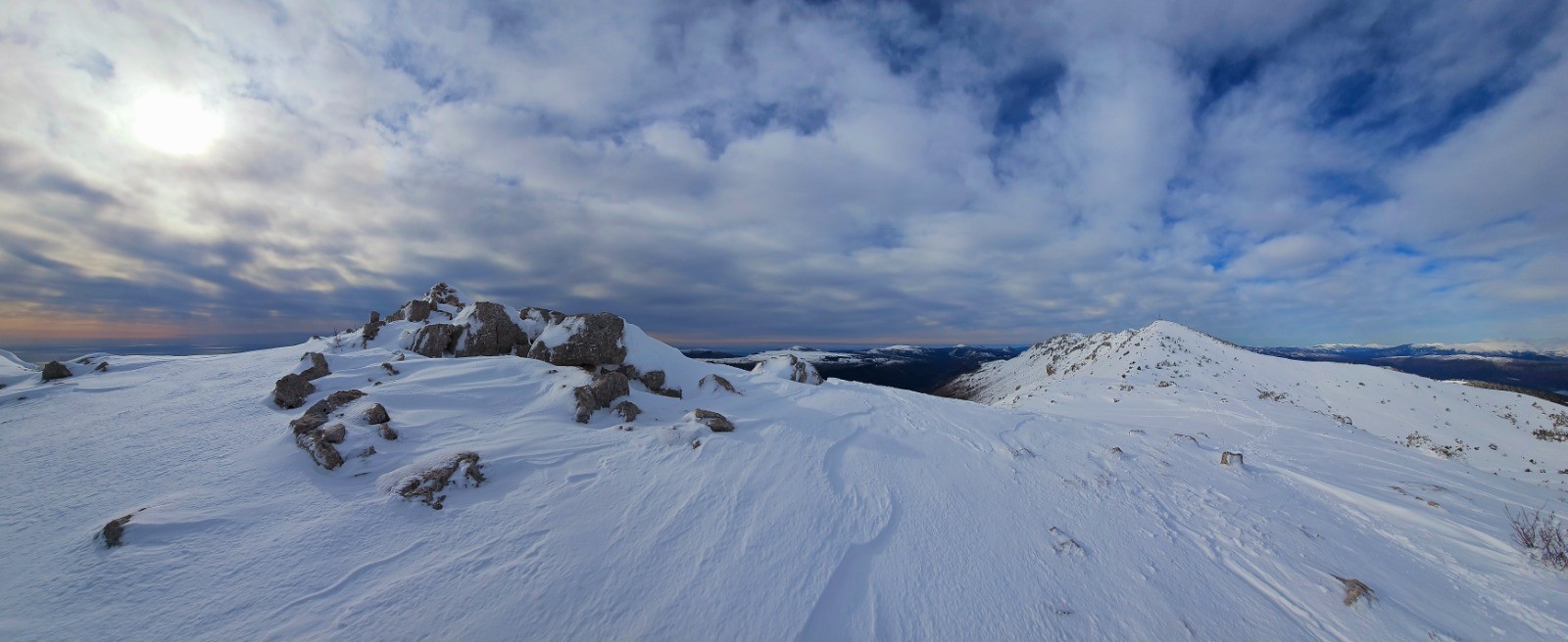 Progression sans difficulté sur large ligne de crête en restant légèrement en-deçà côté nord pour éviter corniches sur l'à-pic du versant sud.