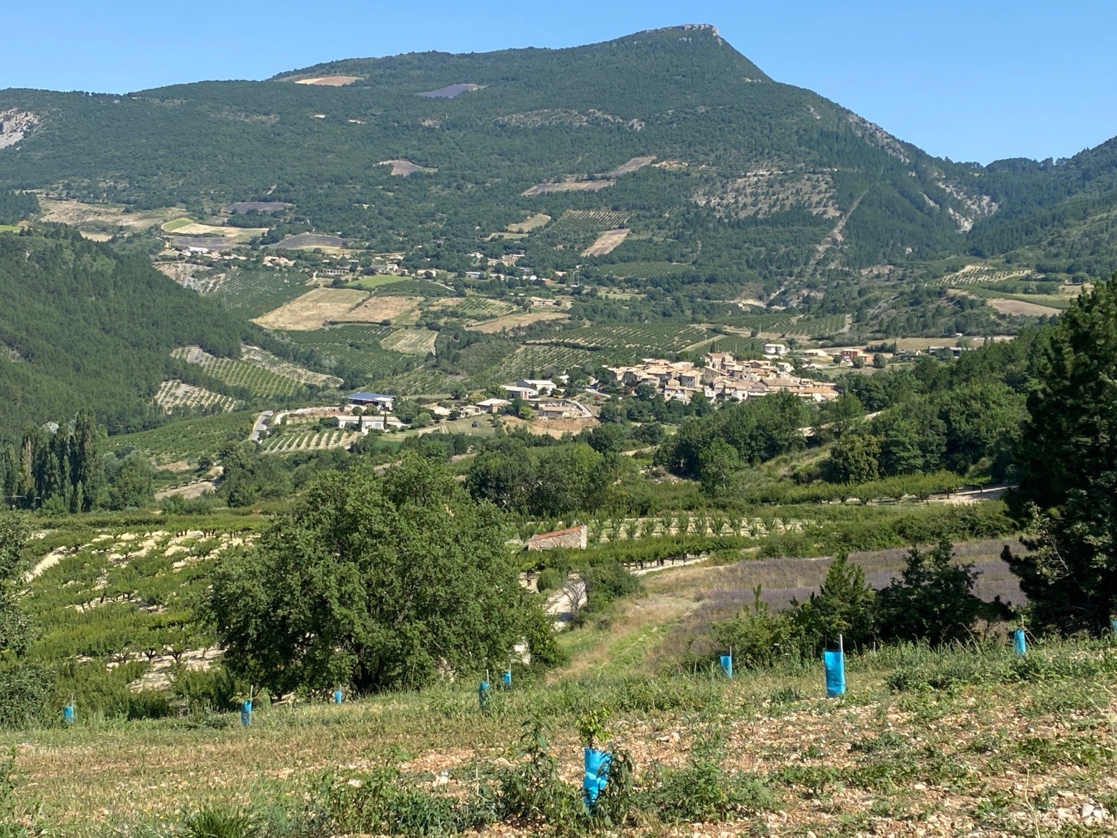 Entouré de collines ravinées de marne bleue et de vergers d’abricotiers, face au Mont Ventoux, le hameau n’est composé que de quelques granges et maisons éparses en vieille pierre et d’une grosse église, bâties sur une pente qui domine la vallée.