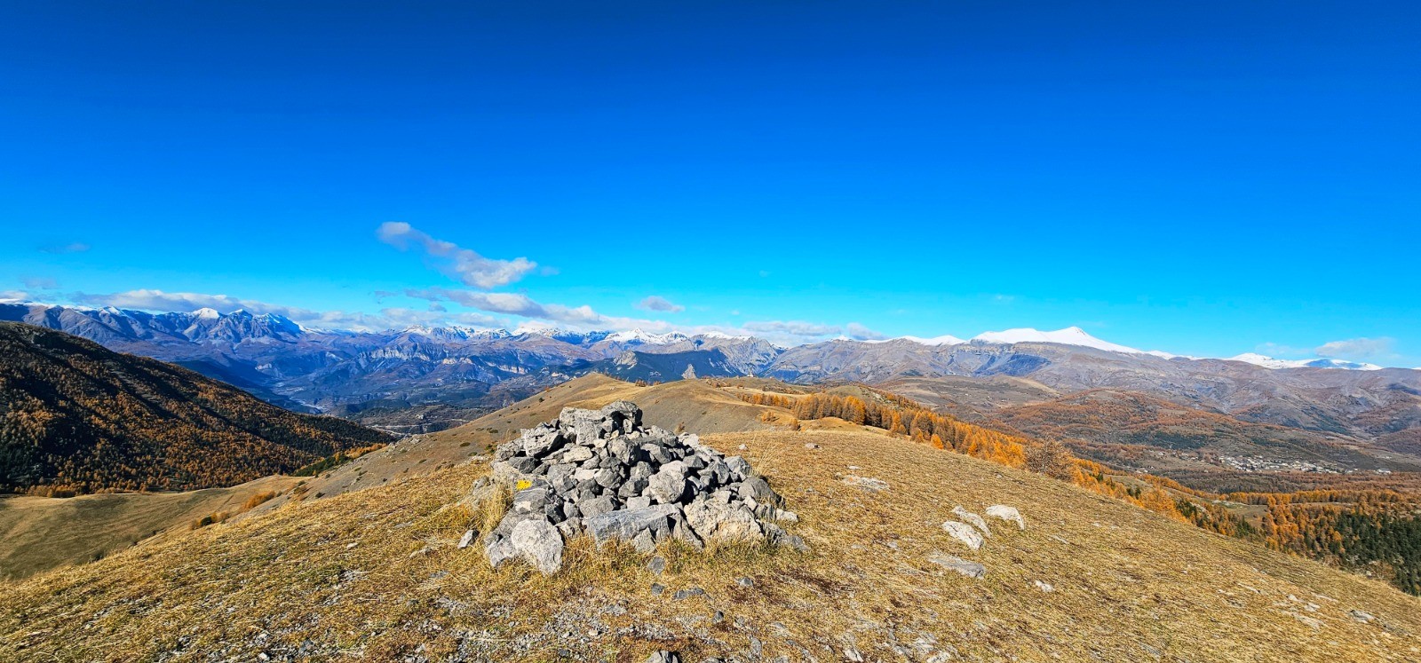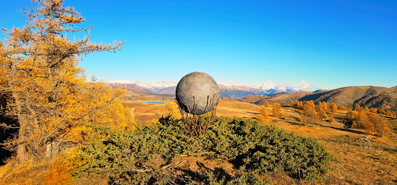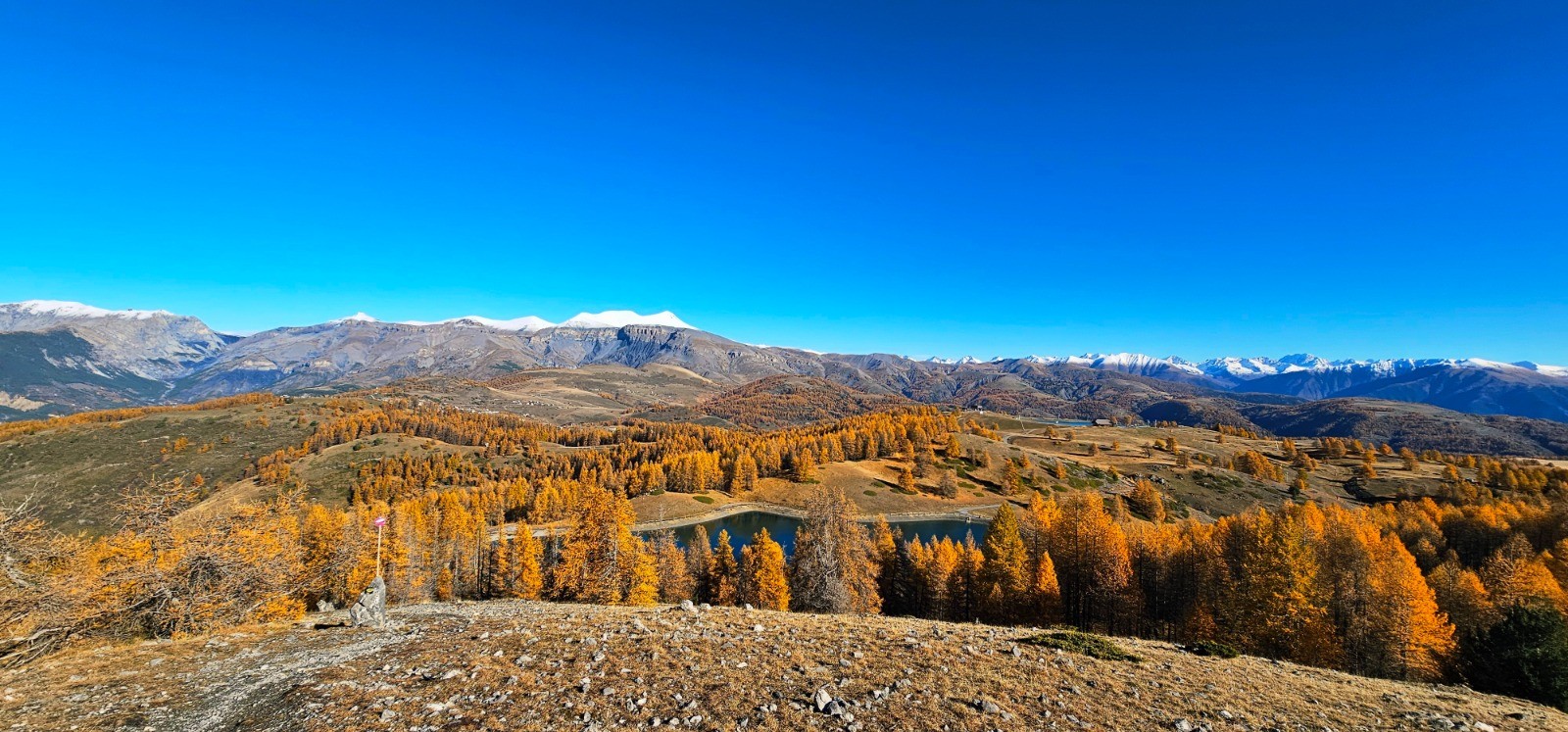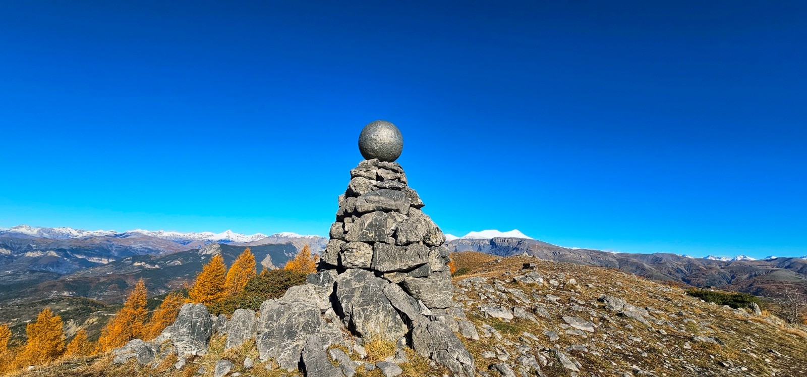 Conclusion : surprenant parcours offrant de magnifiques panoramas durant toute la progression, qui ne soulève aucune difficulté particulière. Superbe environnement automnal à travers mélézins flamboyants, qui contribue à la magnificence de cet itinéraire jalonné d'oeuvres d'art, de lacs collinaires avec vue majestueuse sur tous les principaux massifs du secteur et la chaîne du Mercantour en toile de fond. Cette rando pourrait néanmoins souffrir d'une certaine fréquentation en raison de sa proximité avec les pistes de ski de la station de Valberg mais elle a été réalisée en période pré-hivernale sans rencontrer qui que ce soit sur l'intégralité de cet itinéraire ! il convient donc de choisir avec soin ses dates de sortie mais cette rando qui s'apparente davantage à une sympathique promenade se déroule sans conteste dans un cadre de toute beauté.