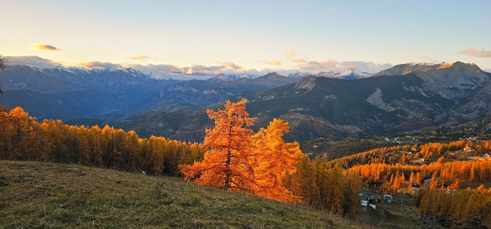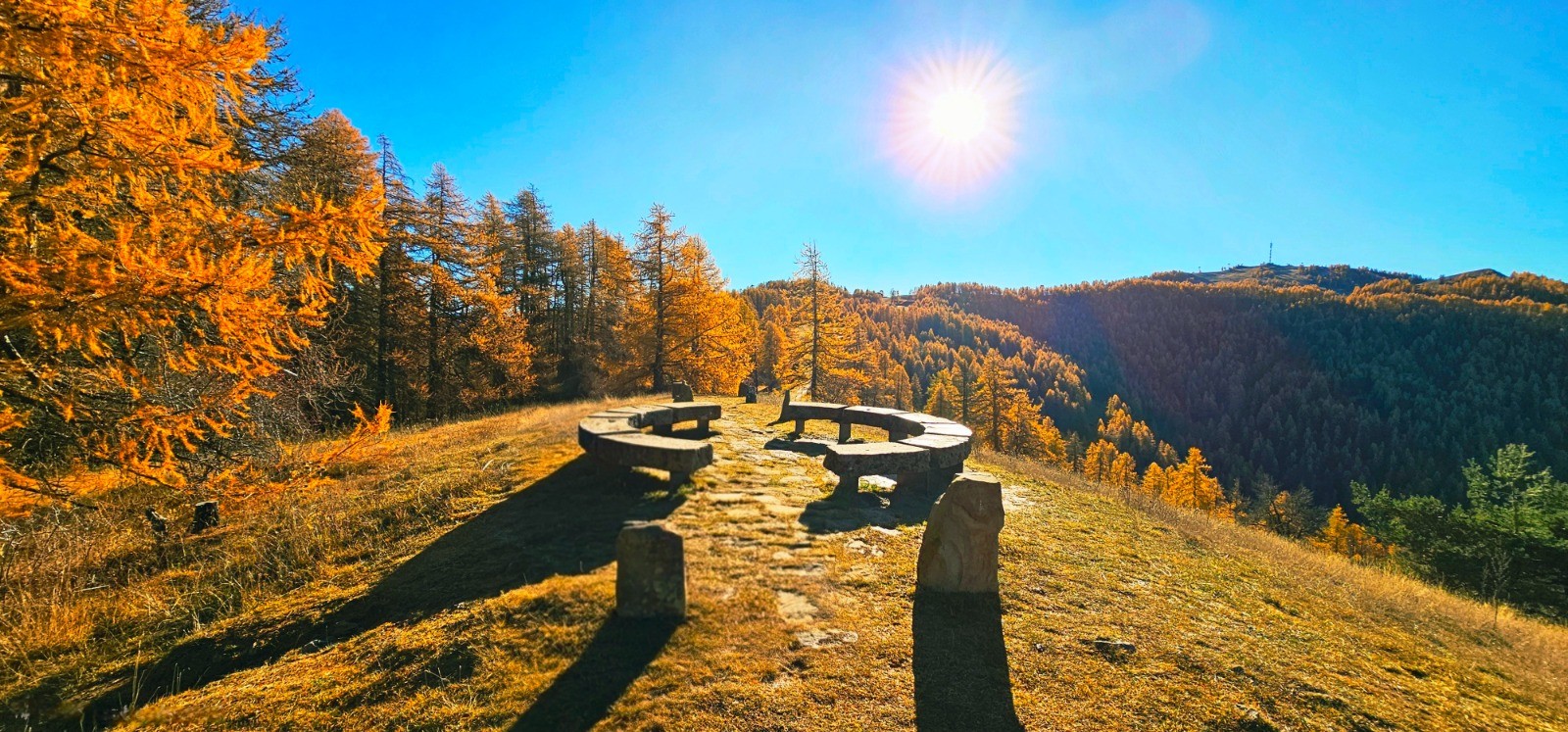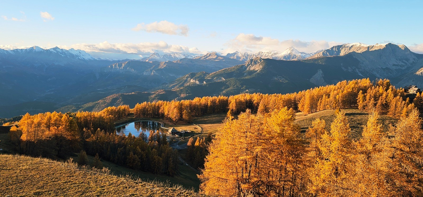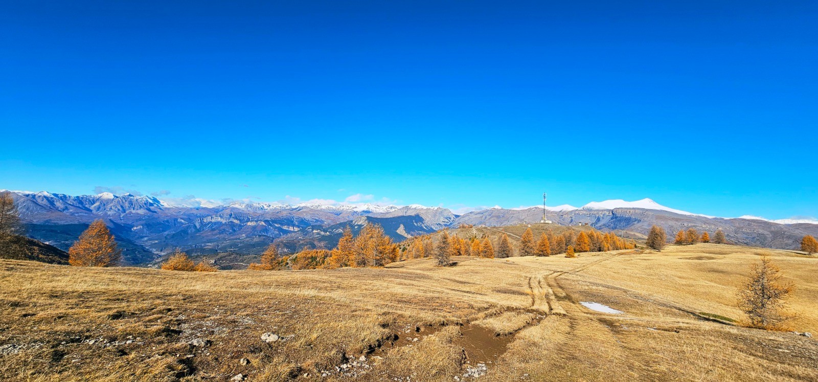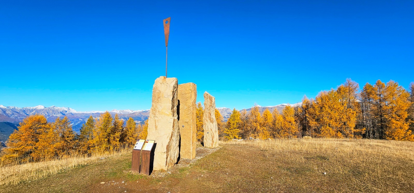 Conclusion : surprenant parcours offrant de magnifiques panoramas durant toute la progression, qui ne soulève aucune difficulté particulière. Superbe environnement automnal à travers mélézins flamboyants, qui contribue à la magnificence de cet itinéraire jalonné d'oeuvres d'art, de lacs collinaires avec vue majestueuse sur tous les principaux massifs du secteur et la chaîne du Mercantour en toile de fond. Cette rando pourrait néanmoins souffrir d'une certaine fréquentation en raison de sa proximité avec les pistes de ski de la station de Valberg mais elle a été réalisée en période pré-hivernale sans rencontrer qui que ce soit sur l'intégralité de cet itinéraire ! il convient donc de choisir avec soin ses dates de sortie mais cette rando qui s'apparente davantage à une sympathique promenade se déroule sans conteste dans un cadre de toute beauté.