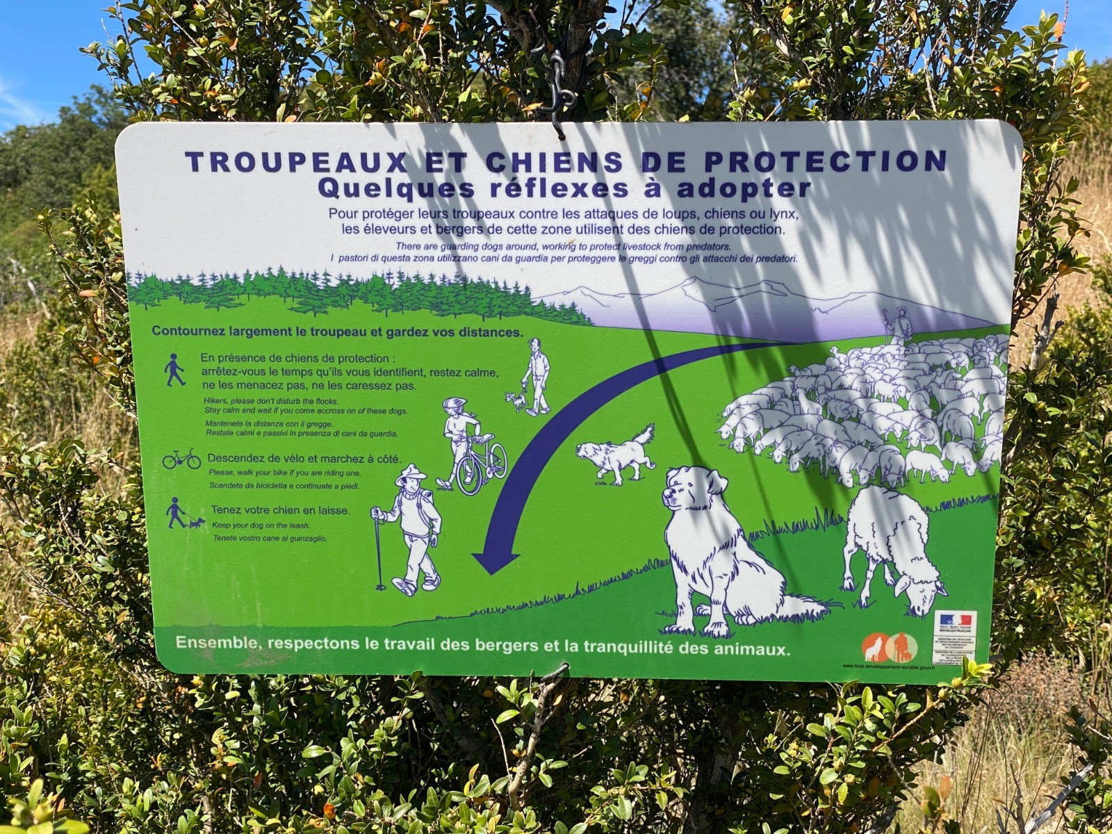 Nous sommes dans une zone pastorale et des panneaux nous rappellent les consignes lors de la rencontre de patous.