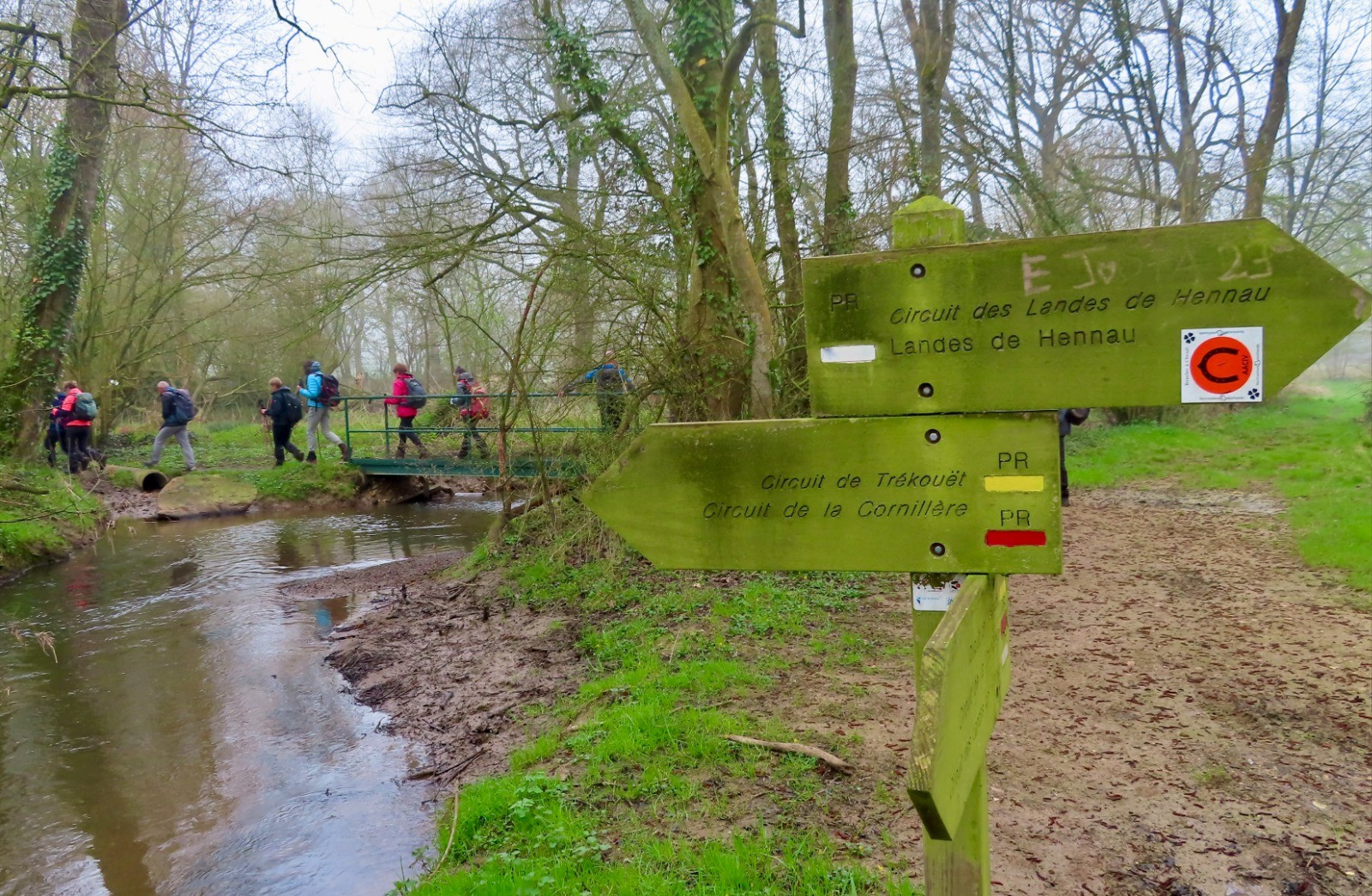 Partir nord, rue du moulin de la Hautière sur le sentier de landes de Henneau. Suivre ensuite le sentier de Trékouët vers la Noë Banesse, la vallée du Meu et les landes de Trékouët. Au KM12 traverser une petite route et prendre la sente forestière descendant dans la vallée du Comper. Continuer sur le sentier de Merlin par le tombeau des Anglais, de Merlin, la fontaine de Jouvence et l'étang de Marette. Remonter nord sur le sentier de Merlin vers la Chapelle Saint-Jouan. Fin du parcours sur le sentier du Pont-Guillé.Circuits de Muel : www.visugpx.com/7Ih5rROJD8