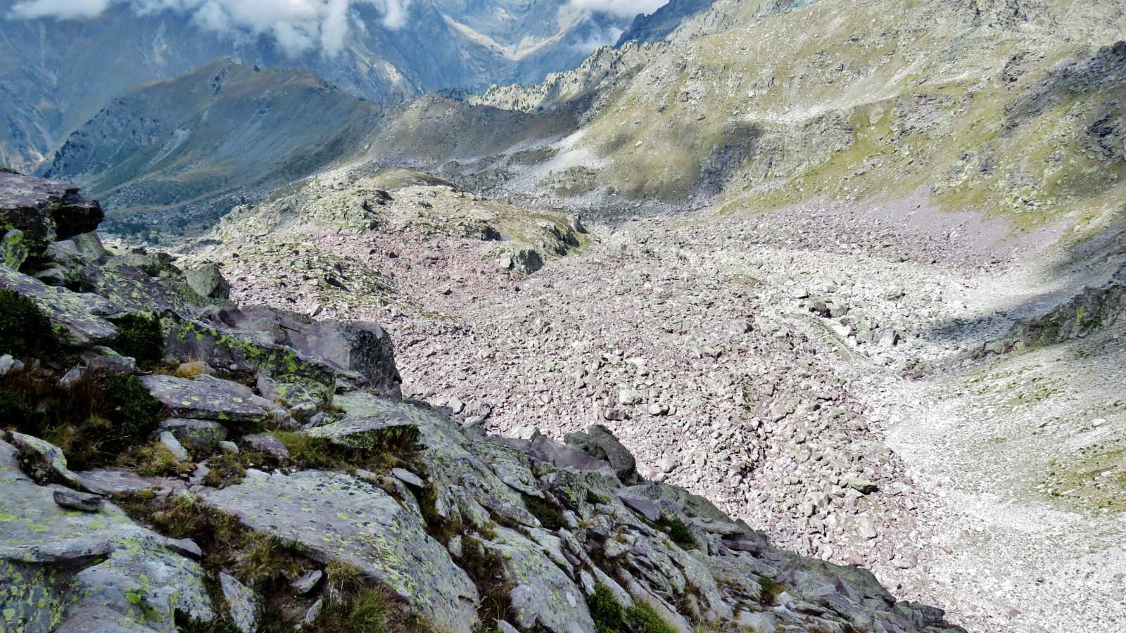 Au Pas du Trem, c’est à gauche, bien sûr ! Il faut trouver son passage dans la descente du gros chaos rocheux du vallon des Verrairiers en se tenant sur la droite dans la partie supérieure.