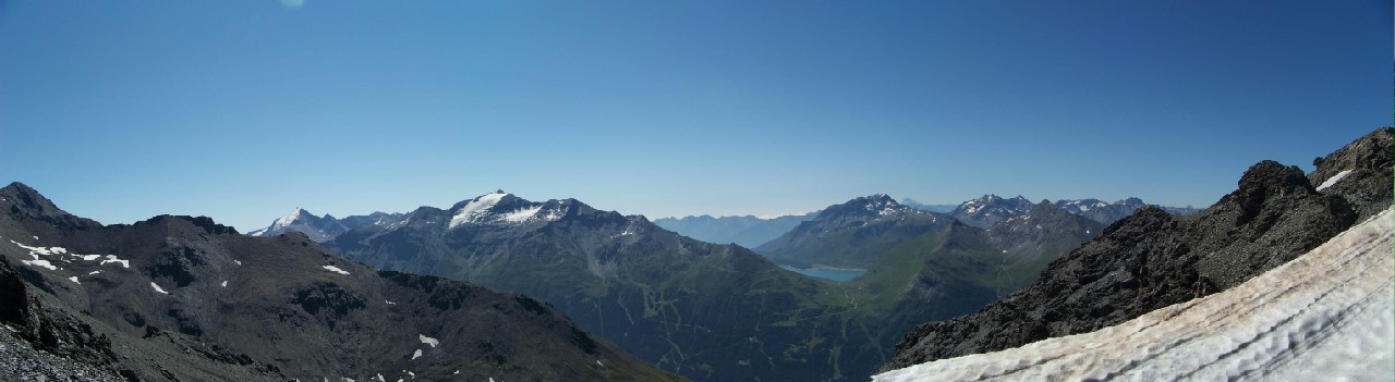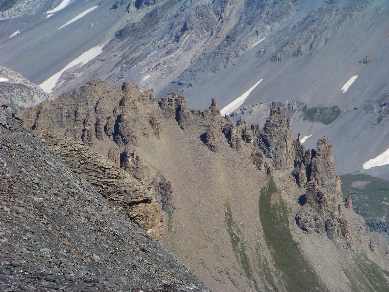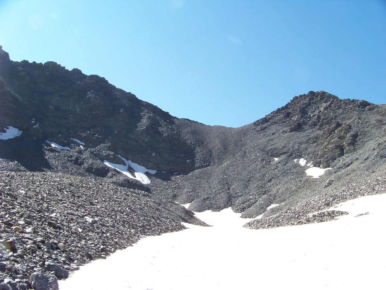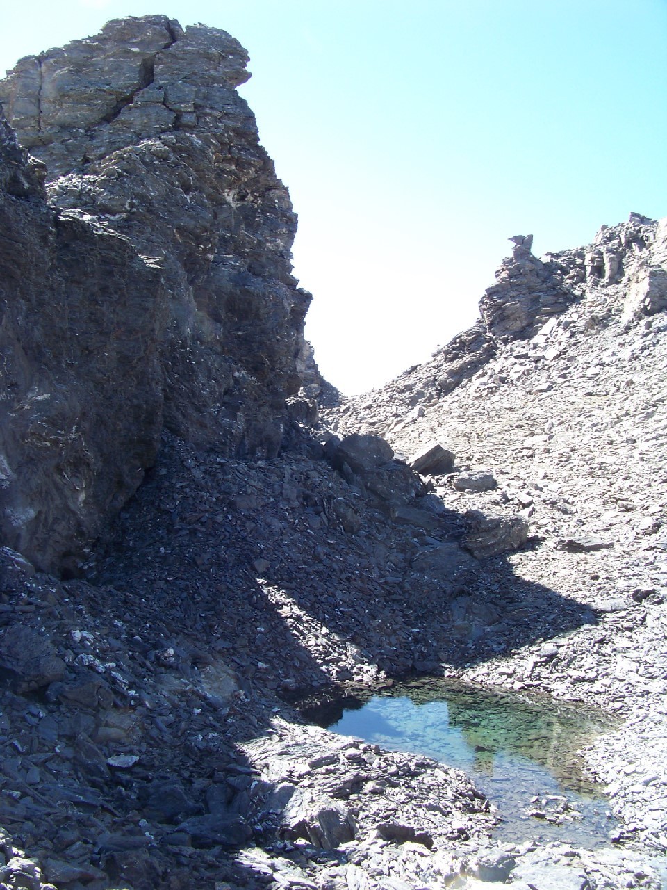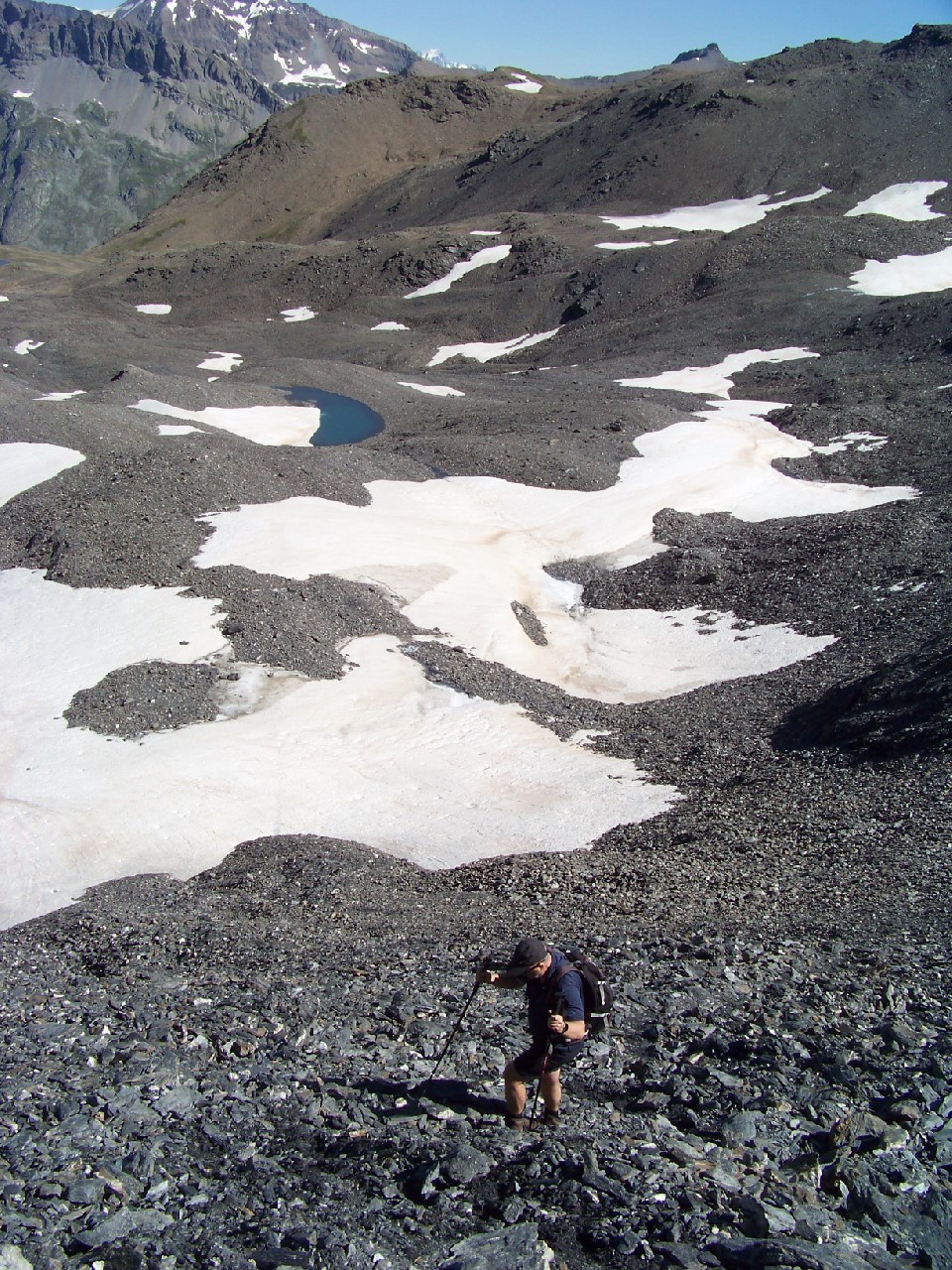 Du sommet partir plein S entre des clochetons marqués, passer au pied d'un étonnant petit lac glaciare aux eaux cristallines, traverser une faille caractéristique (on met un peu les mains) et trouver la grande croupe arrondie de la crête de la Turra que l'on descend jusqu?au "faux col" coté 2812m.