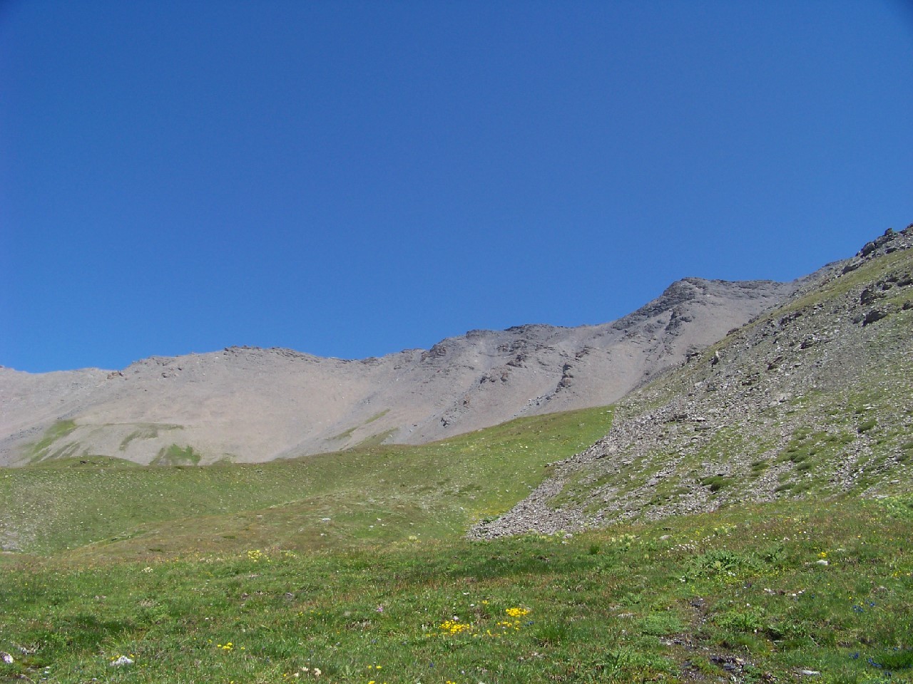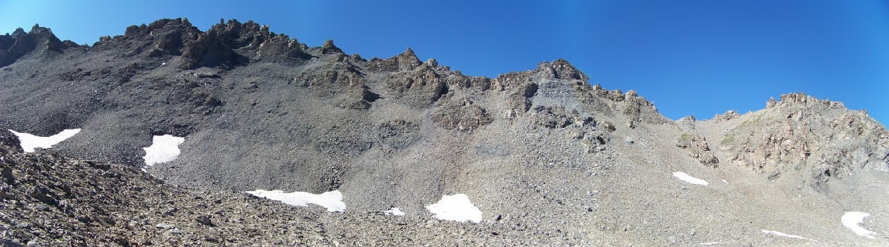 Plonger alors plein W dans des pentes de schistes raides pénible pour retrouver le GR55 et rentrer au parking de Bellecombe.