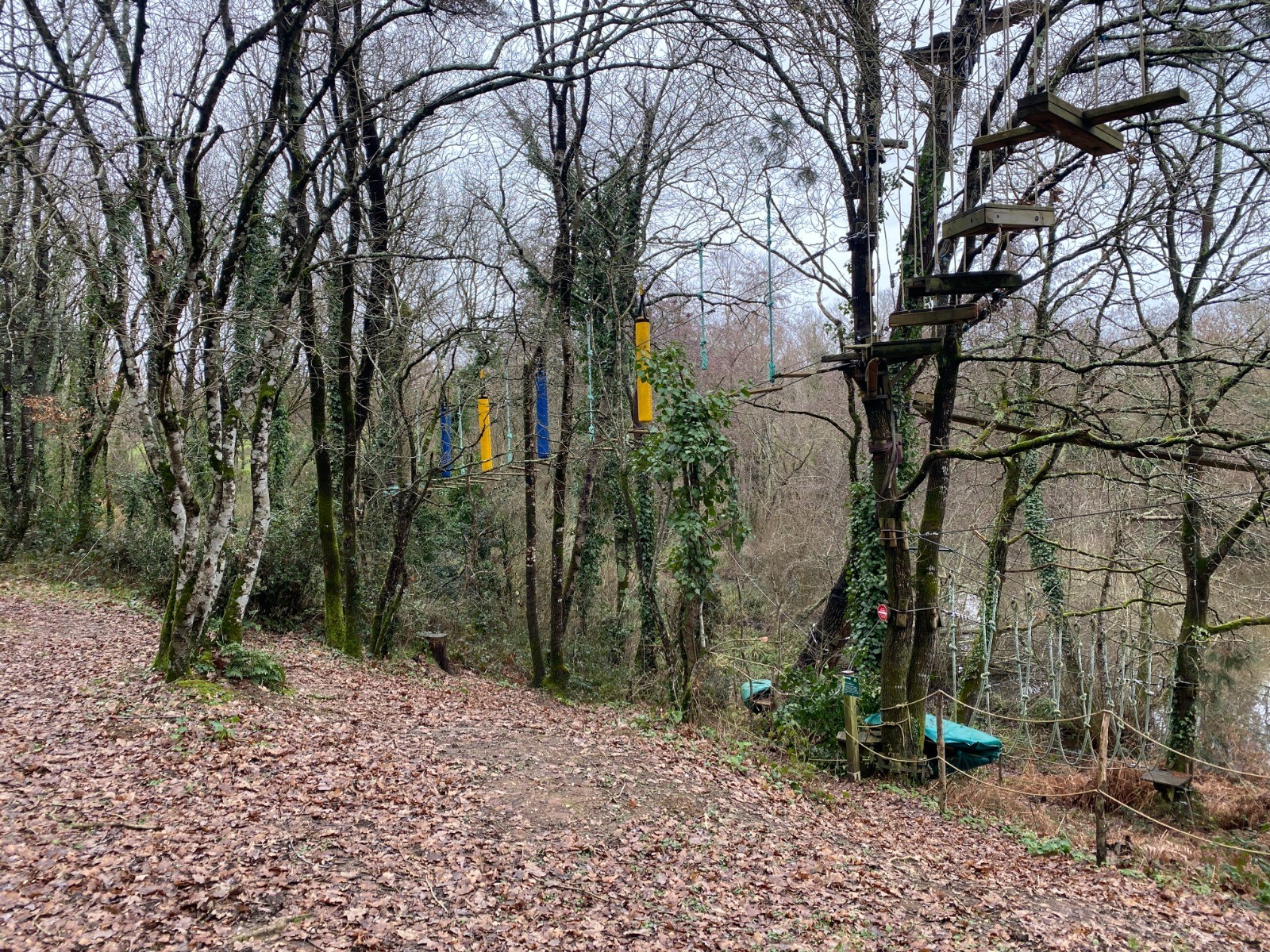 Kilomètre 4 nous voilà queue de l'étang avec le parc d’aventure et accrobranche ( Pornic Aventure ) en forêt situé, autour et au-dessus de l’étang.