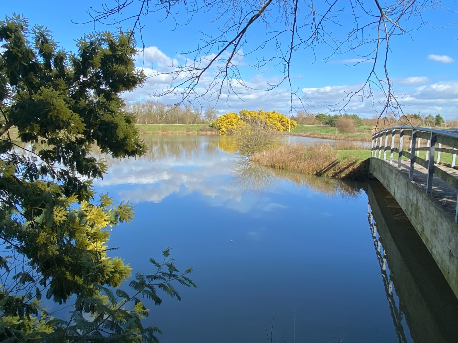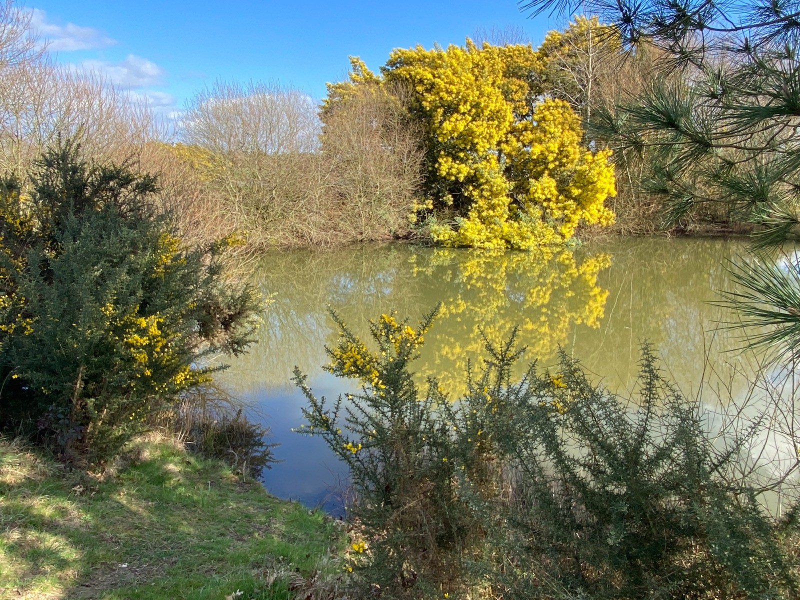 Aujourd'hui tout est réuni pour que le paysage soit grandiose : le soleil, un ciel bleu clair avec quelques nuages, une forêt de mimosas, des bouquets de jonquilles... cela laisse place à de belles photos avec reflets dans l'eau.