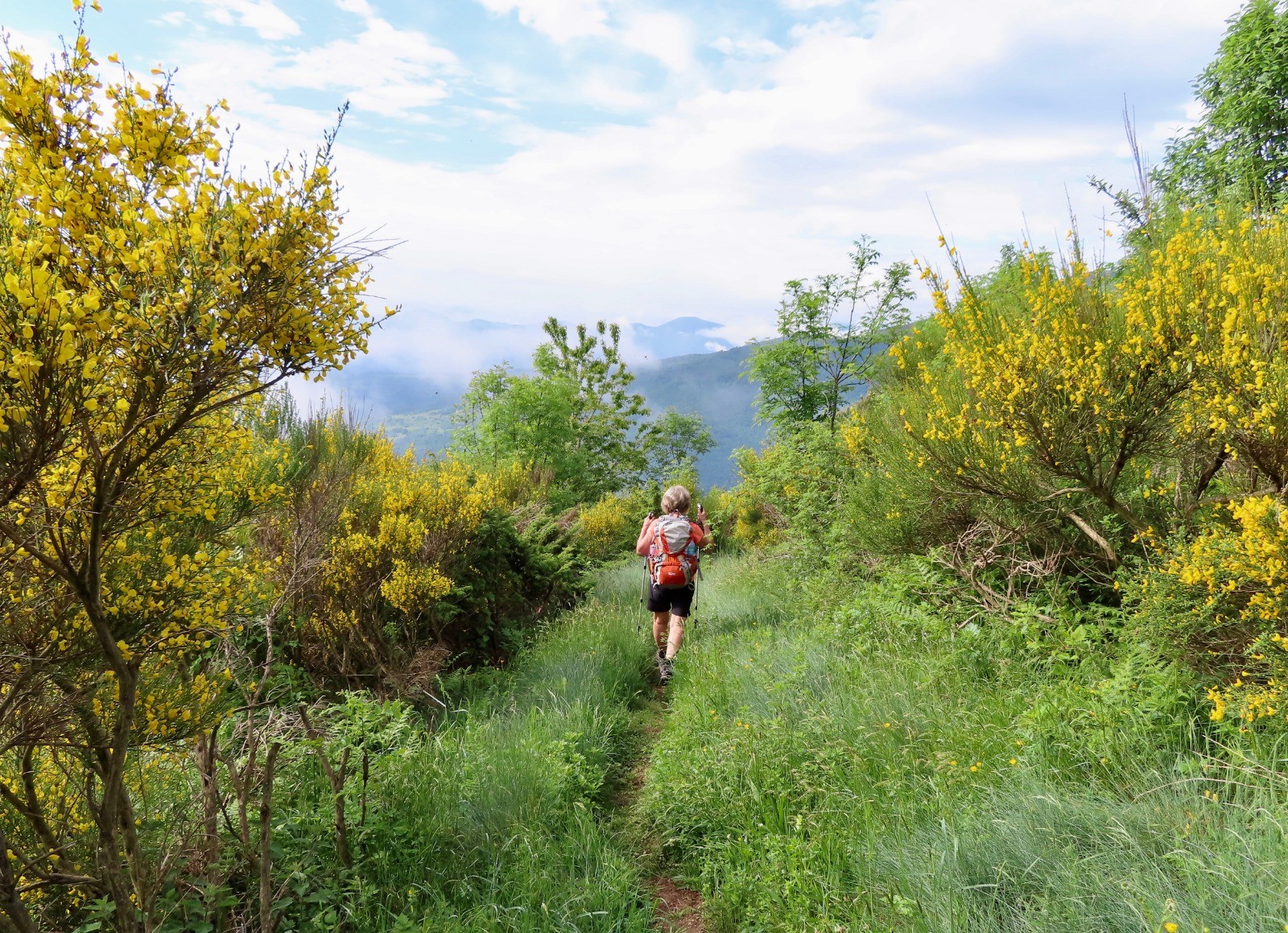 Au col de la Descarga, nous commençons la descente du GR10 sur un sentier verdoyant avec vue sur la tour de Batère dans les nuages. Au fil de la descente le sentier est de plus en plus rocailleux avec de nombreuses traces du passé minier : câbles semi-enterrés, pylônes rouillés du câble aérien, l'ancienne gare d'aiguillage de Jacouty ...