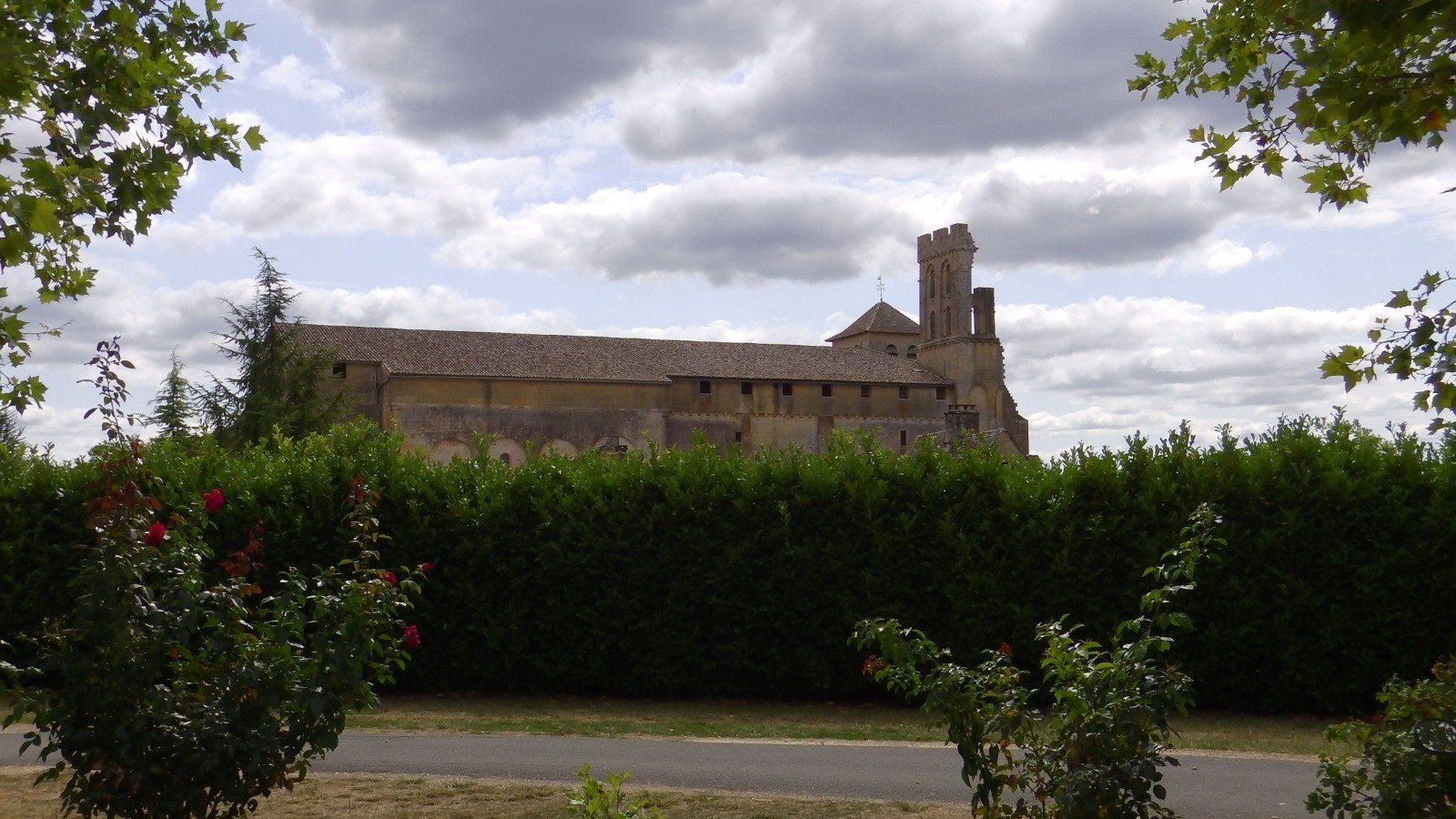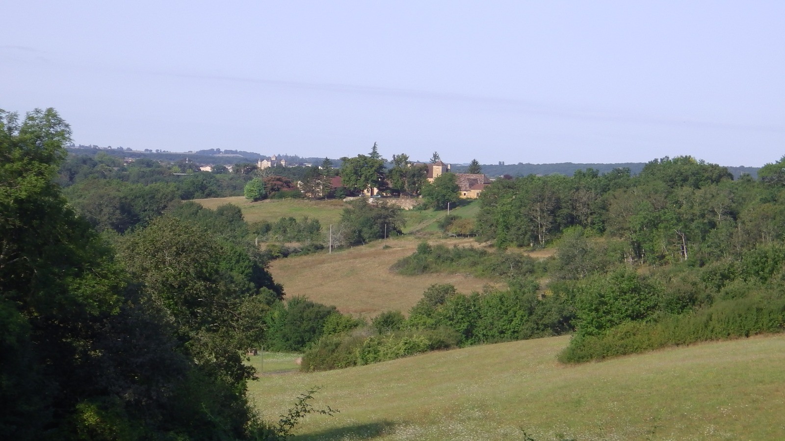 Suivre ce balisage qui remonte vers une route, la suivre à gauche et la quitter lus loin à droite vers le camping de La Grande Veyière où la route laisse place à un beau chemin qui va déboucher sur la D 25 qu'il faut suivre sur 80 m avant de prendre le chemin de droite (balisage). Après avoir serpenté à travers champs, il rejoint une petite route qui passe à Terre Grasse et Aux Robert. Au croisement suivant prendre à gauche et retrouver la route prise à l'aller. Au croisement, prendre en face le long d'un ancien séchoir à tabac, traverser la D 25 et suivre le chemin herbeux (bien tondu) sur la droite puis aux barrières monter vers le village, l'église et l'ancien cloître méritent une visite.(café face au cloître...)