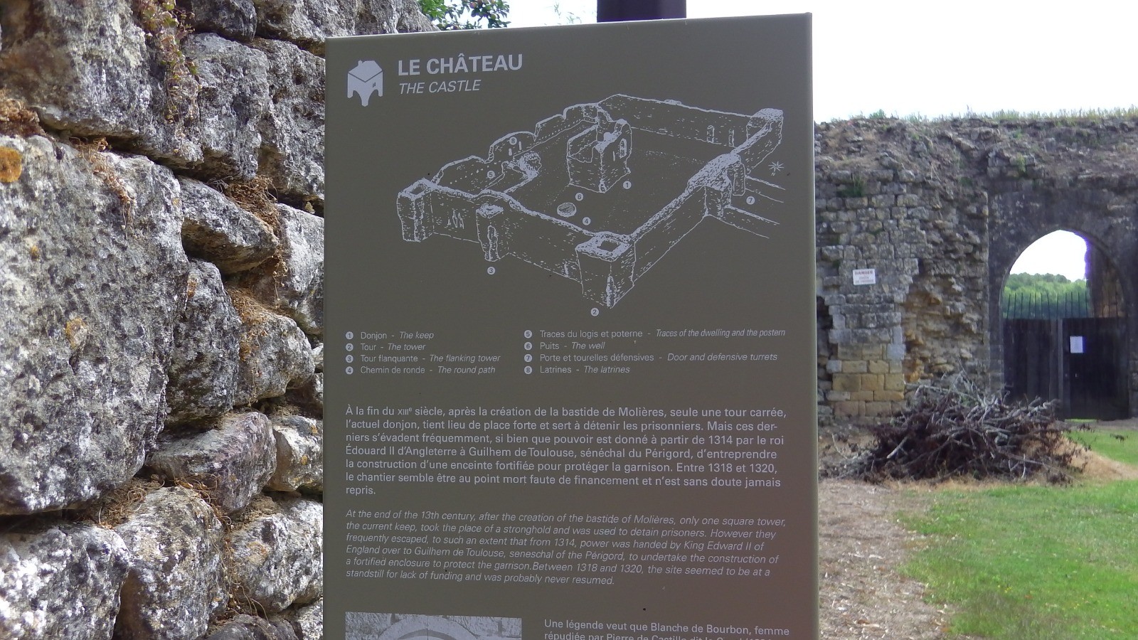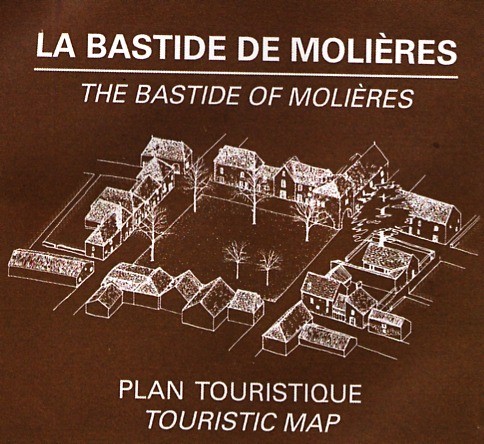 Prendre la route qui mène directement à Molières , la quitter pour traverser le hameau "Le Petit". Au centre de ce hameau, au niveau d'une vieille porcherie, prendre le chemin qui part à droite, entre Le Pontet et Les Pradoux et arriver aux bacs du tri des ordures ménagères. Prendre la route à droite et monter vers Molières. Passer devant l'église et arriver sur la place principale de la bastide où on ne peut voir qu'un seul couvert.