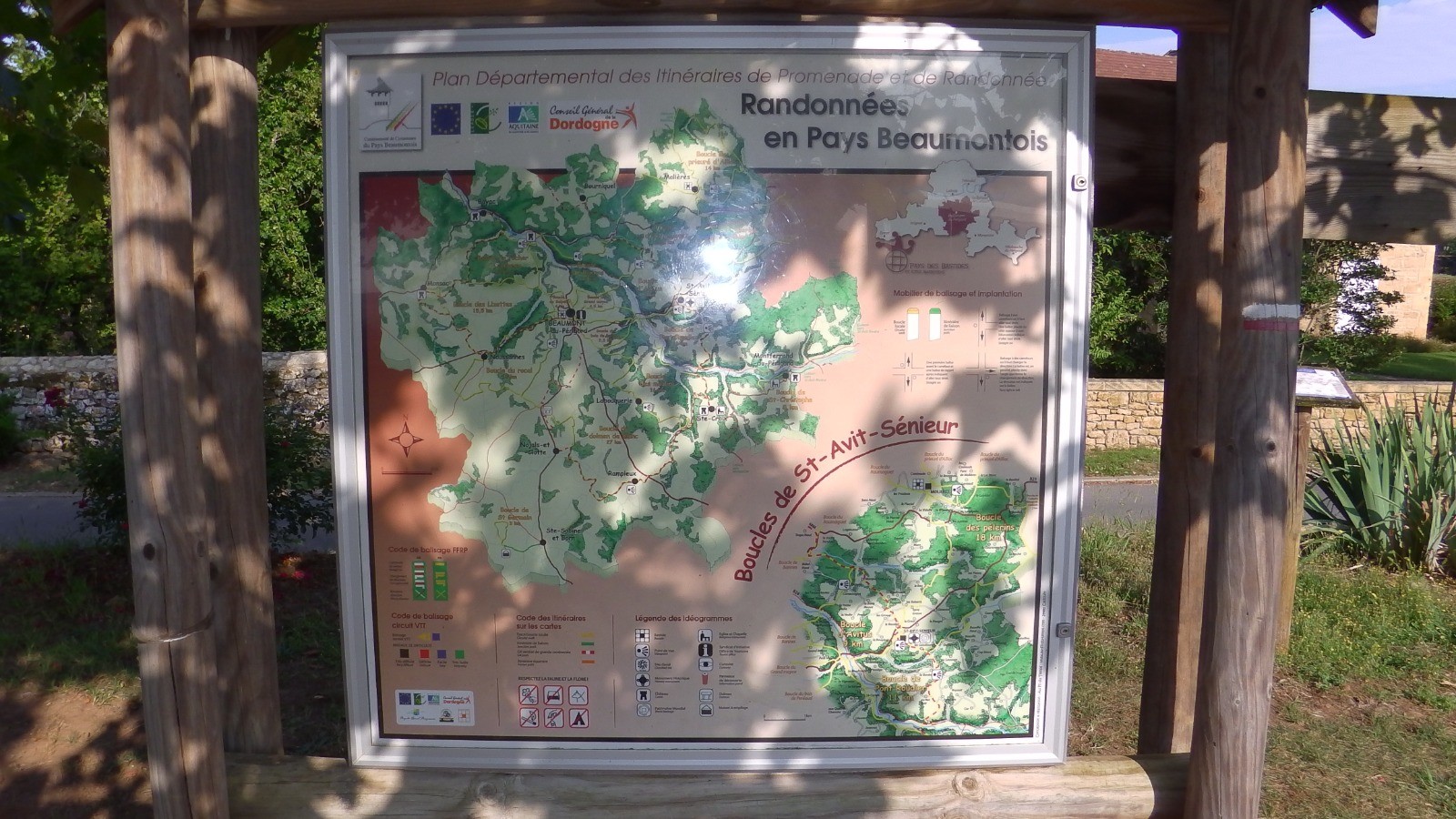 Départ: parking école de St-Avit-Sénieur - balisage jaune typique de la Dordogne.Partir vers le N/E et sortir du village. Traverser la grande route et continuer tout droit (laisser la route Des Roberts à droite) vers Marqueyssol en prenant le chemin qui part droite (GR 6E).