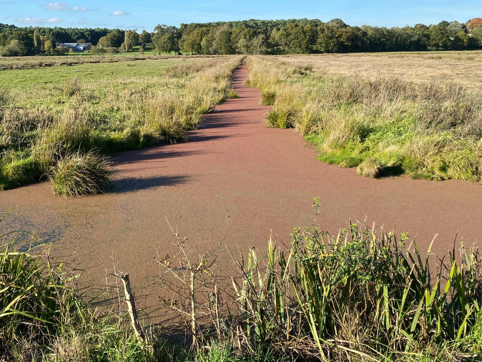 Une fougère aquatique ( photo no 13 ) invasive originaire d'Amérique du Nord nommée "azolla" apporte une touche rose voire rouge à l'eau des marais.