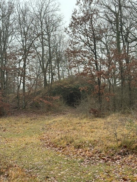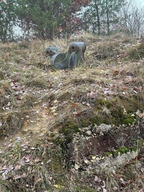 2 – Faire demi-tour et prendre à droite une petite sente (vers piquet bois) sortir sur un plus grand chemin avec sur la gauche une pièce en fonte des anciens canon de 240 postés sur le haut. Continuer et à la hauteur du dés en béton sur le gauche, prendre à droite une sente qui descend dans les bois pour rejoindre la route d’Occident.