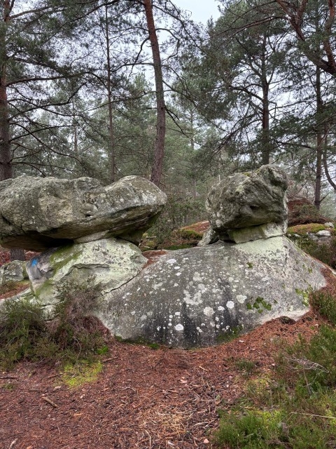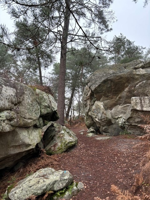 6 – Passer entre les deux blocs et accéder au point de vue sur Fontainebleau et un peu en retrait le rocher de Léonard de Vinci (*) sur le droite, en continuant sur votre gauche un superbe pin en Lyre avec son rond bleu, poursuivre en passant le passage des sept roches (C), continuer par le puits du Diable (*) énorme trou dans un bloc, sur votre droite le rocher de Louis Lépine(*) et en face sur la colline un bloc en biais dît le rocher du Bon Paul, plus loin la grotte de Lord Byron (*) et la roche Lacontrie (B) et sortir de nouveau sur la route d’Occident.