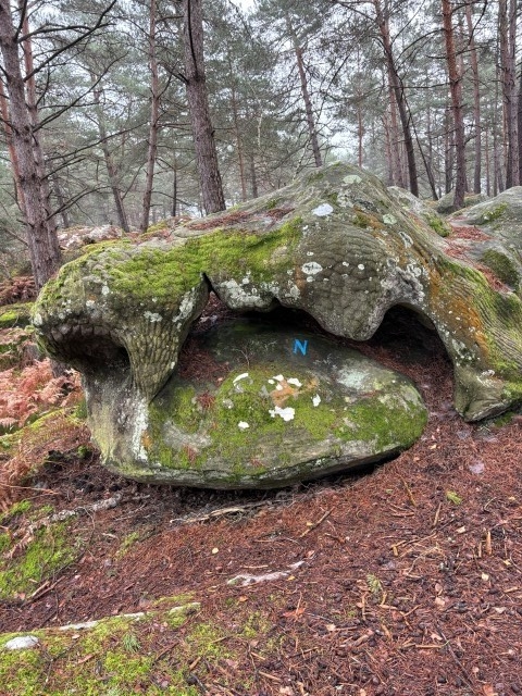 4 – Revenir sur le sentier bleu et continuer celui-ci pour découvrir successivement une multitude des blocs auxquelles Denecourt donna des noms : La pieuvre des Rochers (N), le Petit Sphinx de Bouligny (*) au milieu du chemin, plus loin la grotte Decamp (M), sur la droite encore plus loin le Crapaud de Bouligny (L) et en face la Roche à deux Têtes(*) en continuant sur la platière devant la Licorne (K) et plus bas la Caverne du Sycophante (J) un peu plus loin le banc du Sphinx (I) et en passant le sentier le rocher de Luchet (H).