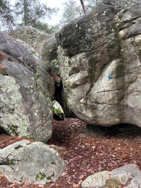 5 – Continuer le sentier bleu et continuer d’admirer les diverses roches : le Menhir de Bouligny (*), le passage de la Landelle (G) plus loin l’Arche de Bouligny (F) sur votre gauche le rocher de Regnard (D) et arriver en face les Mazarines (*).