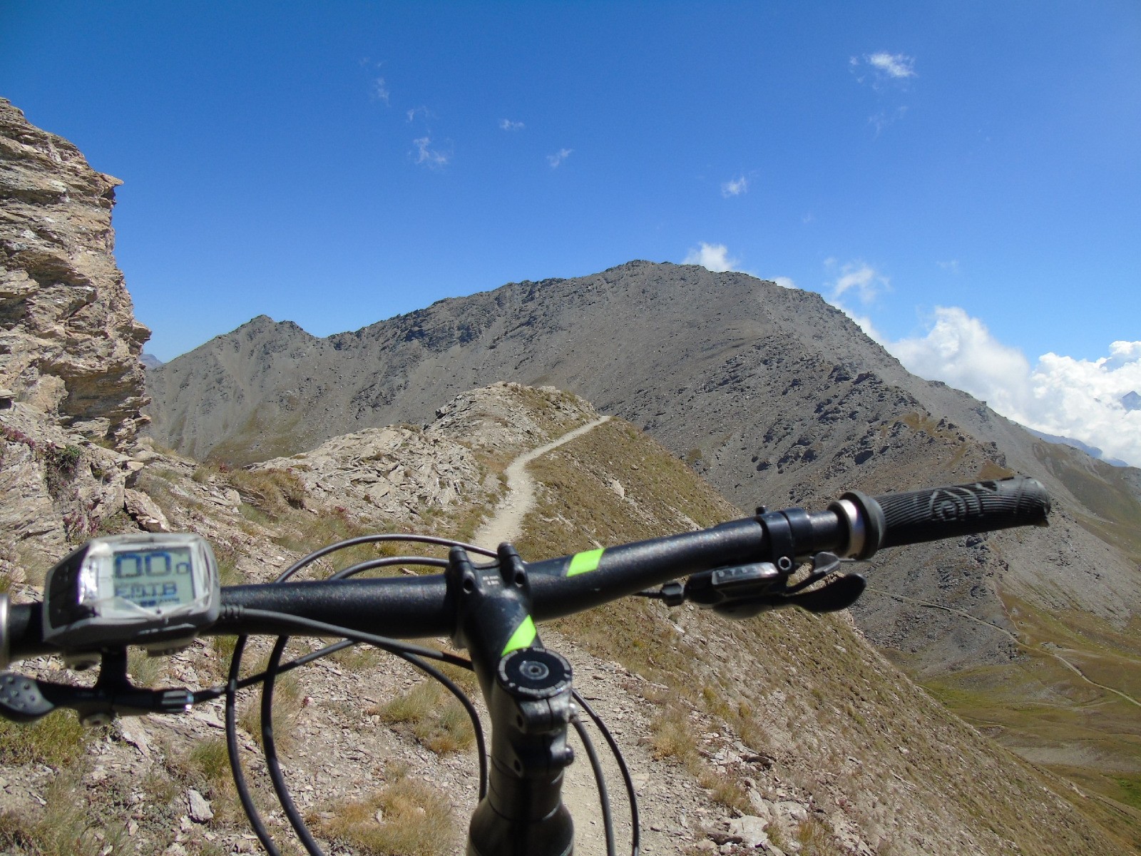 On porte ou pousse le vélo, alors, sur une succession de petits lacets très serrés, mais ça passe bien, puis vers le haut les lacets sont moins serrés. Cela représente en gros 100m D+ jusqu’au fort du Mont Froid (2800m).