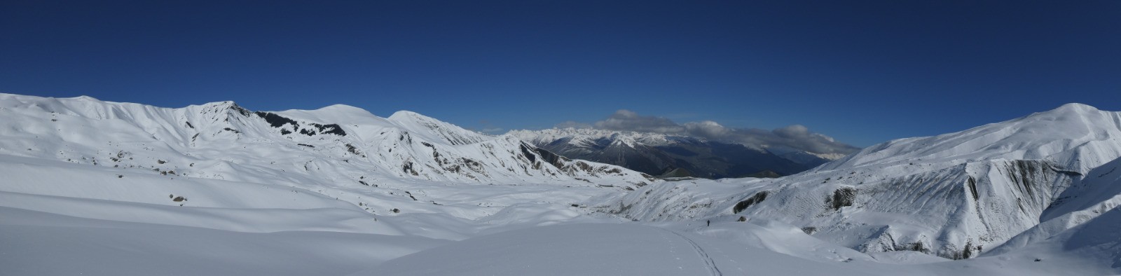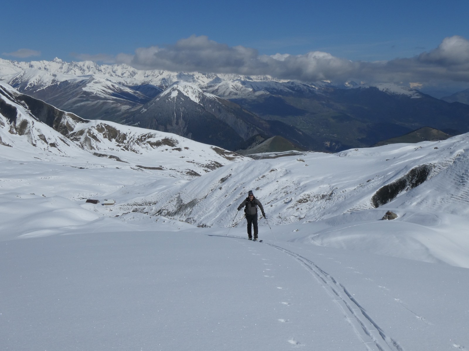 Enneigement conséquent quand même, surtout au-dessus de 2000m. Les dernières chutes de neige permettent de chausser les skis dès 1800m et sans déchaussage jusqu’au col. Ce n’est plus commun à cette époque, mais quelle chance.