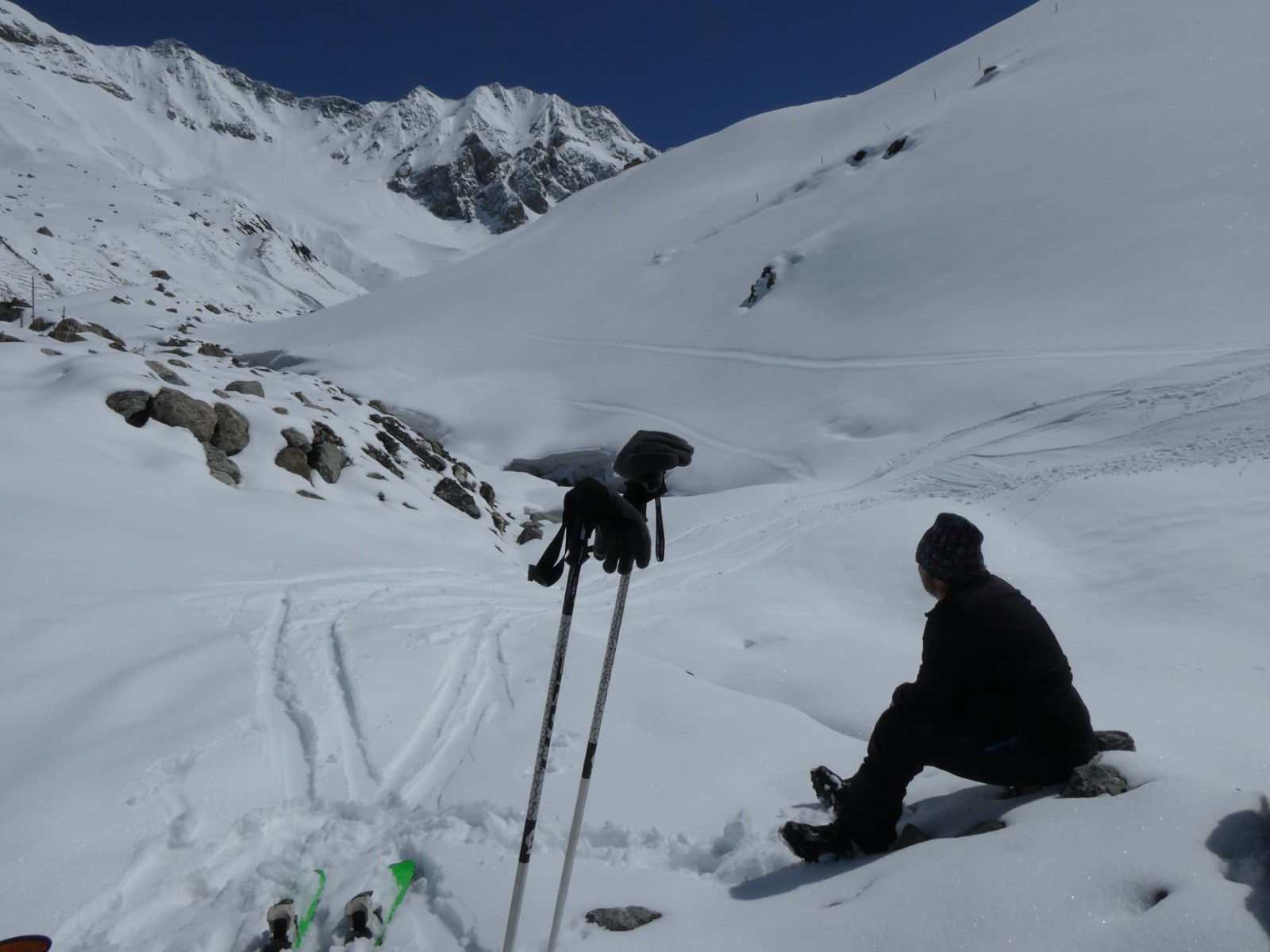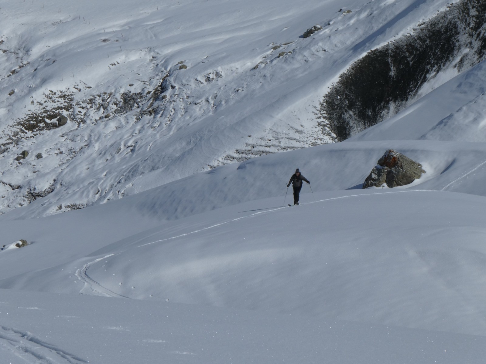 Descente au plus simple dans le vallon compte tenu de cette neige inskiable.