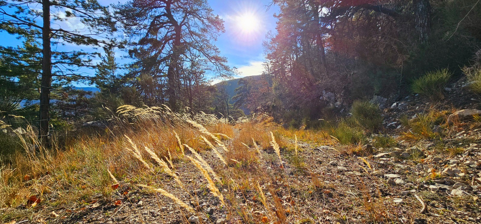 Débuter plein Est pour récupérer la balise 51 et gravir à droite côte modérée jusqu'au réservoir d'eau dominant le vallon du Passé. Poursuivre vers la B 52 qui matérialise la véritable boucle du circuit et obliquer à droite pour montée continue mais graduelle au col d'Avenos (3,31 km avec d+ 255 m). Point haut matérialisé par un seul cairn en bordure d'une petite ligne de crête dominant la forêt domaniale du Haut-Estéron. Descendre la piste sur 0,44 km pour rejoindre le replat du col du Trébuchet situé en contrebas et desservi par axe routier (D 10).