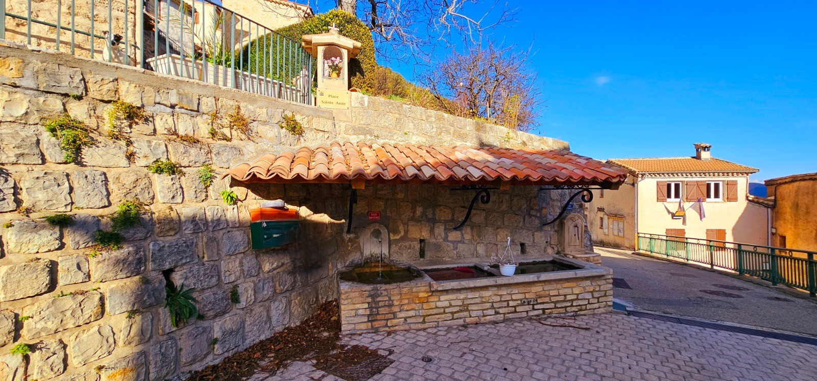Approvisionnement en eau assuré par fontaine lavoir sur face Est de la chapelle.