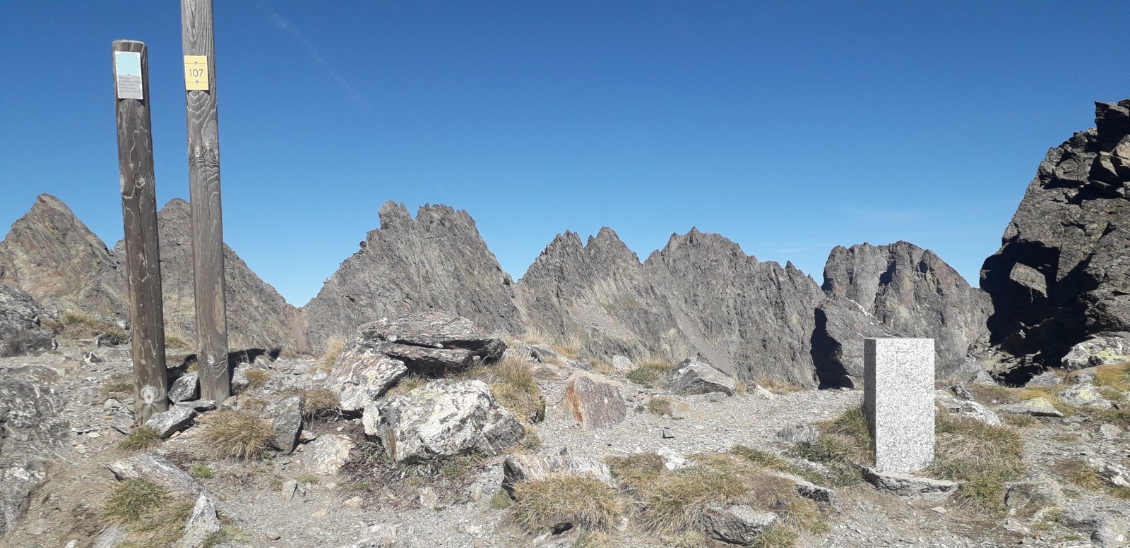 Mentionnons qu'il est possible de traverser la crête sommitale et de descendre par un sentier escarpé à hauteur de la croix en bois (marquage sur roche par points rouges) mais ce sentier vous ramène aux lacs Varicles avant de remonter jusqu'au lac Fer par un itinéraire déjà parcouru, pour rejoindre les balises 110 ou 103 afin de rejoindre St-Etienne-de-Tinée. J'ai pris le parti de revenir par le même itinéraire (cheminement plus agréable) jusqu'au refuge de Rabuons où j'avais laissé une partie du contenu de mon sac à dos pour m'alléger.
