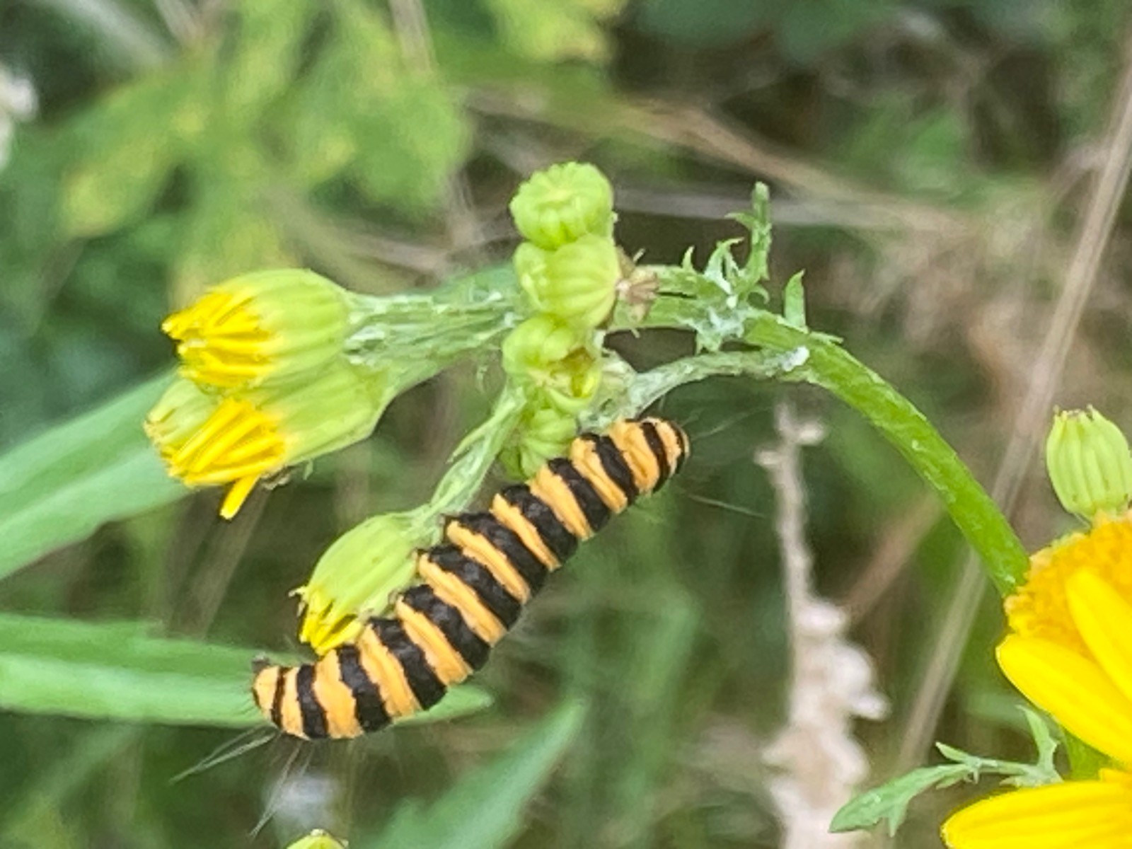 "Le séneçon jacobée : à surveiller pour trouver dessus les chenilles à anneaux orange et noirs de la goutte de sang, un papillon de nuit ; deviennent toxiques en mangeant le séneçon très toxique : c'est pour çà que dans les prés pâturés il reste en place !"