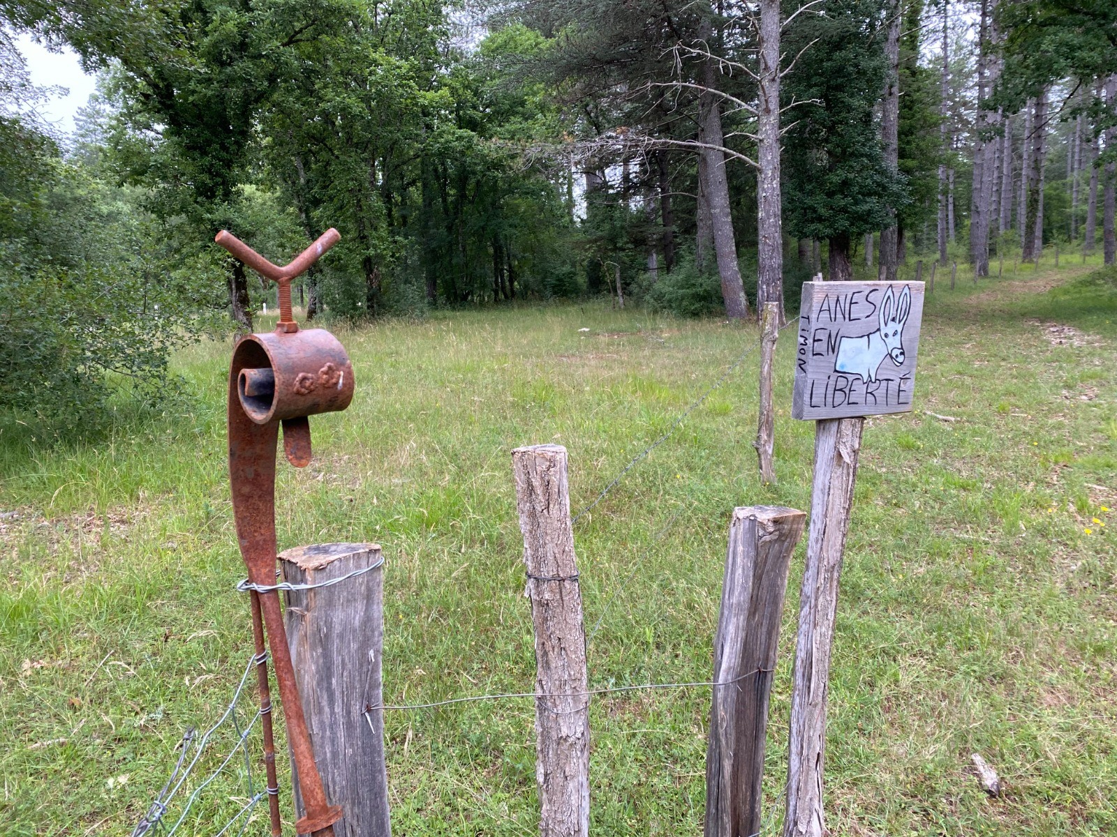 A l'entrée d'un chemin : une pancarte "attention ânes en liberté" ( photo no 5 ), vous pouvez emprunter ce chemin en prenant soin de fermer la barrière.