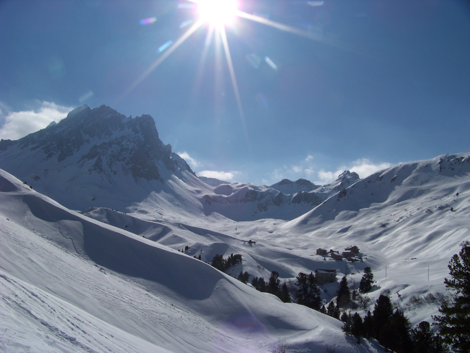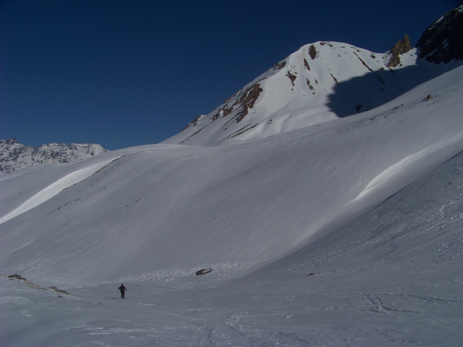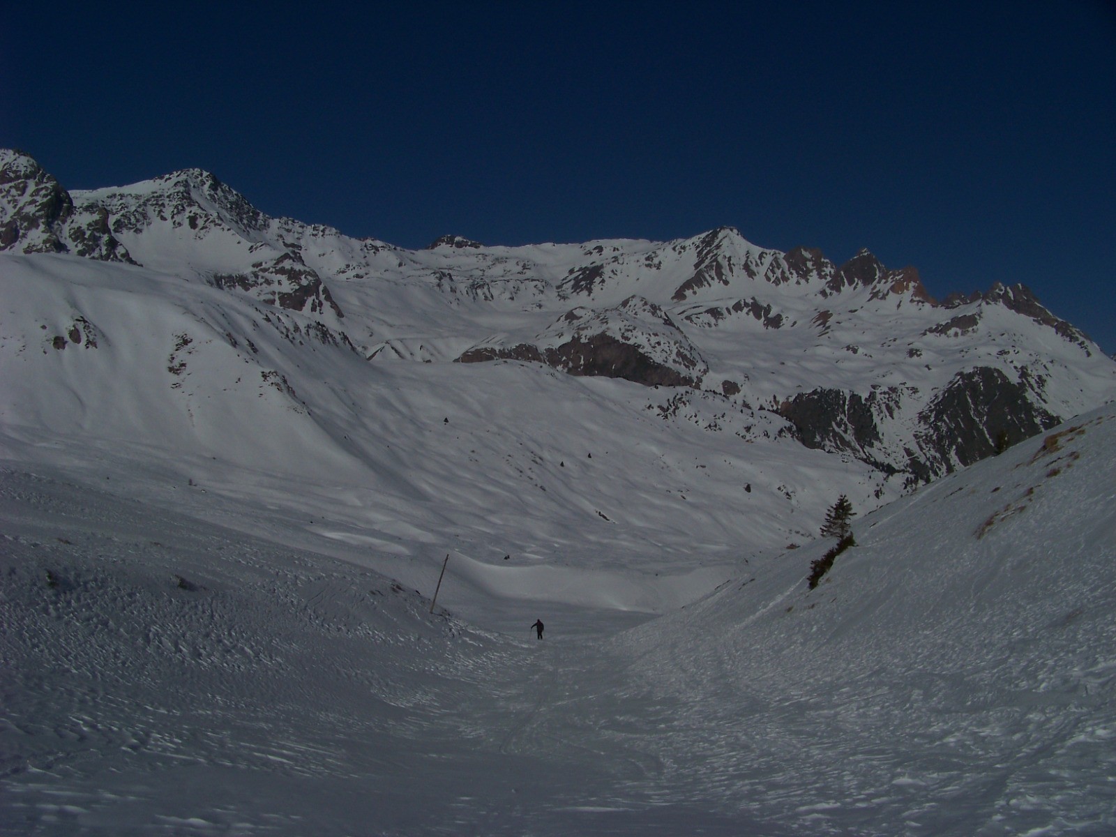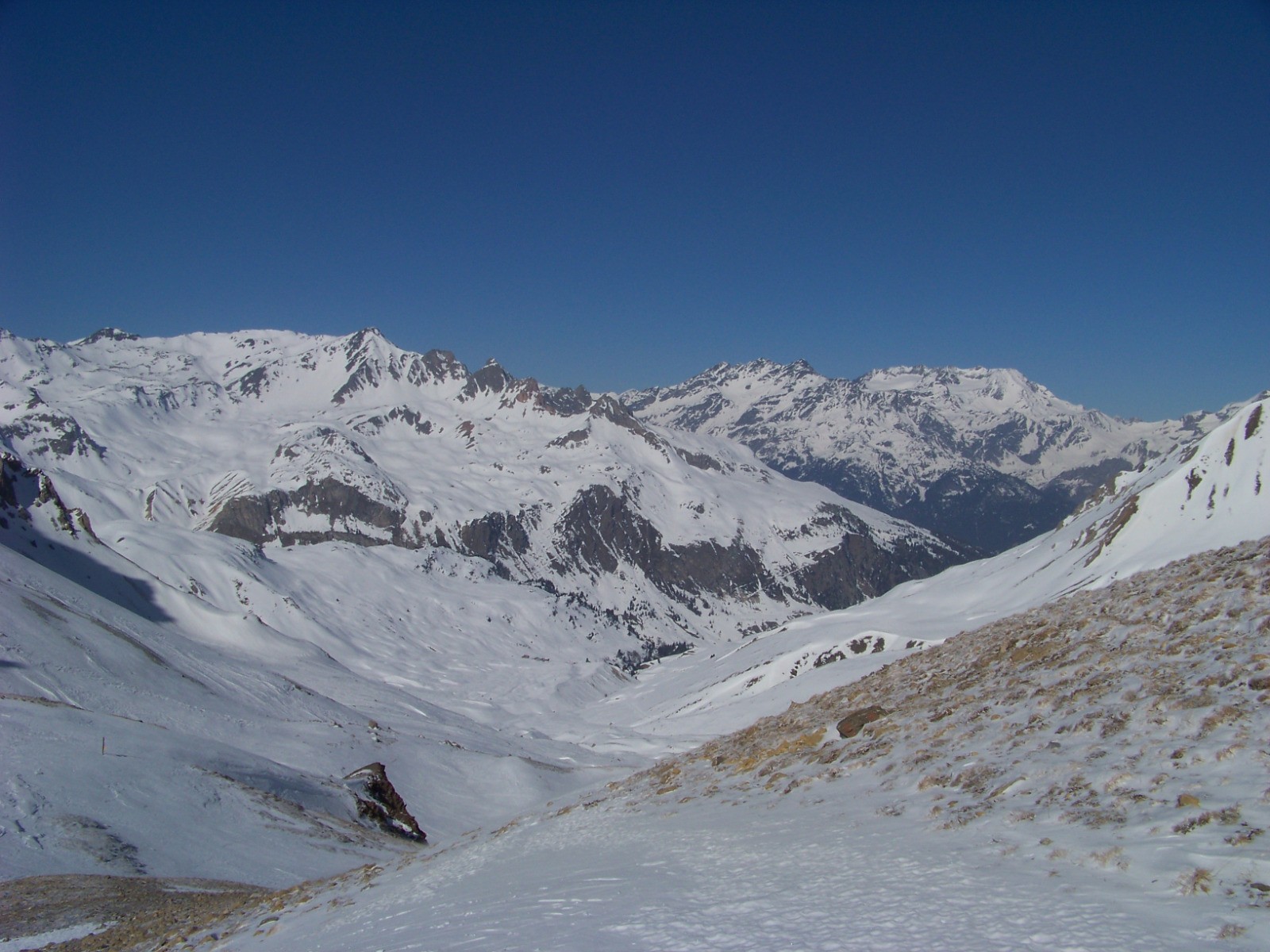 Belle rando à ski dans un cadre très alpin, très ouvert au fond d'un long et large vallon.