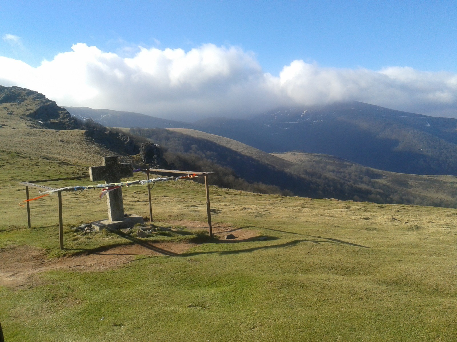 La route continue de monter ,puis après des portions de plat, voire de légères descentes parvient à la croix Thibault ou l on quitte la petite route, pour suivre à droite une piste qui passe à coté d un gros cairn et d une stèle élevée en mémoire des martyrs des forces Françaises combattantes et se dirige vers le col ouest du pic Leizar Atheka.