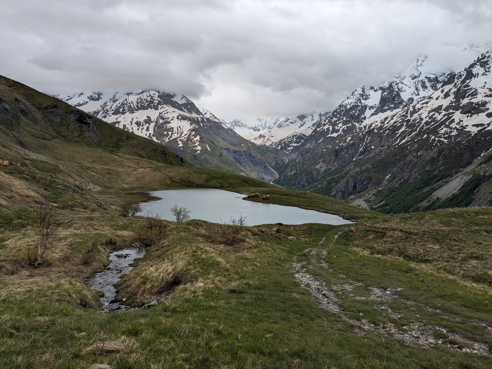 Suivre la chemin qui descend sous le lac puis une bifurcation a gauche (large mais pas très visible) qui vous ramène vers le village.