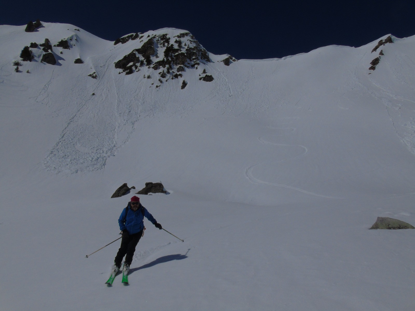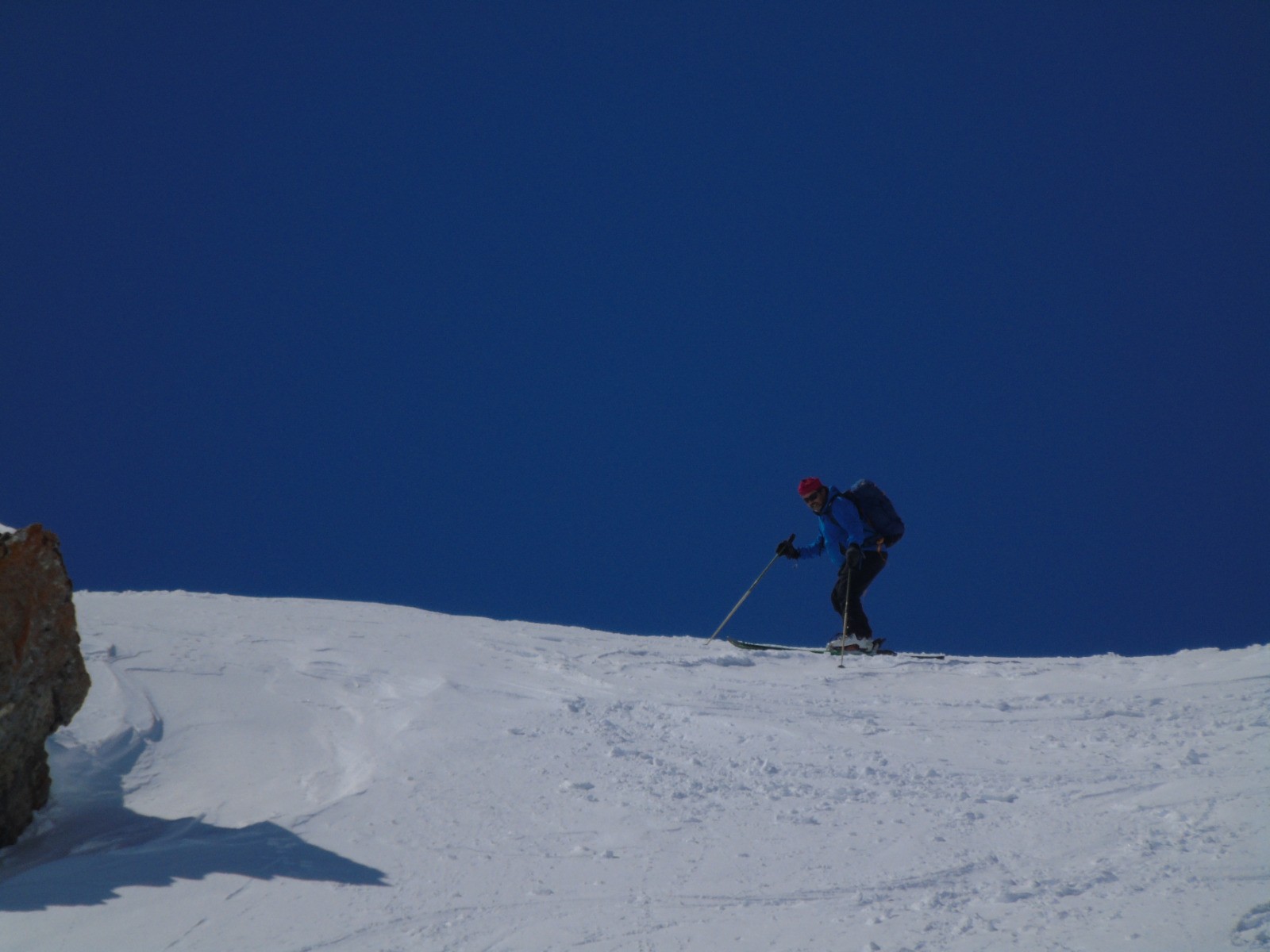 Descente par la facette NE depuis le sommet jusqu'au grand replat à la côte 2150m ( la facette fait120m/35°).