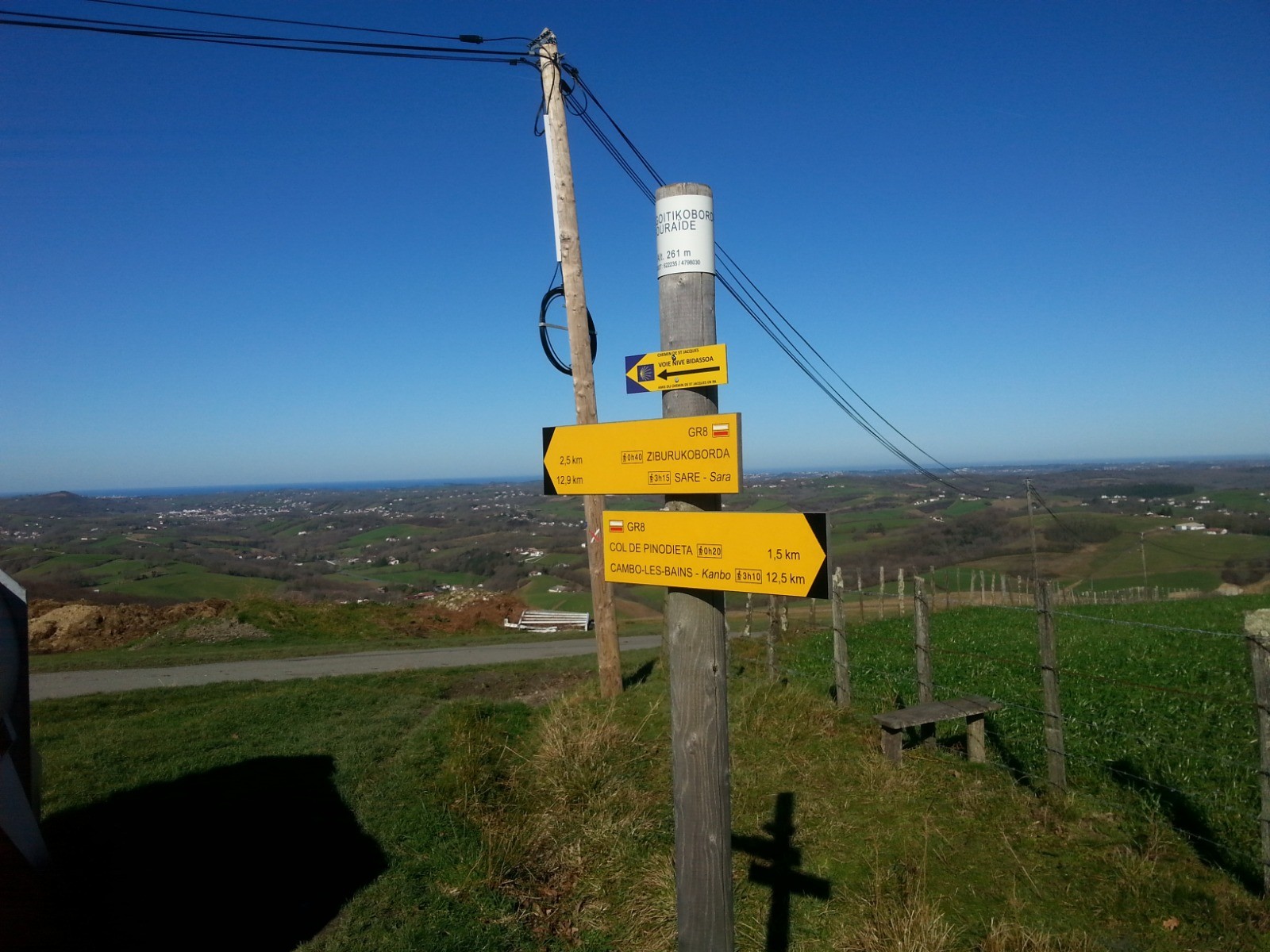 .Avancer en balcon sur la vallée de la Nive, avant la descente prononcée jusqu’au carrefour de Pasteroenea( fermes 12.5km) à ce point il convient d’être vigilant , car on abandonne à droite la Voie du « chemin de poste » vers Bayonne; prendre à gauche en descente, et descendre tout droit jusqu à la D932. La traverser à gauche sur 50 mètres, puis prendre la piste à droite vers le petit bois. Suivre le sentier jusqu à Domingoenea et descendre la petite route; pour arriver à l entrée du pont et de la voie ferrée et remonter vers le centre d’Itxassou , en suivant la D 219; passer le fronton et monter à droite vers le petit aérodrome d’Itxassou ; au parking suivre tout droit sur 700 mètres et au niveau d’une maison isolée( piscine ronde) prendre à droite si l’on veut descendre vers le bourg d’Espelette, traverser la D 918 et continuer droit vers l’église. OT ( Mairie)..