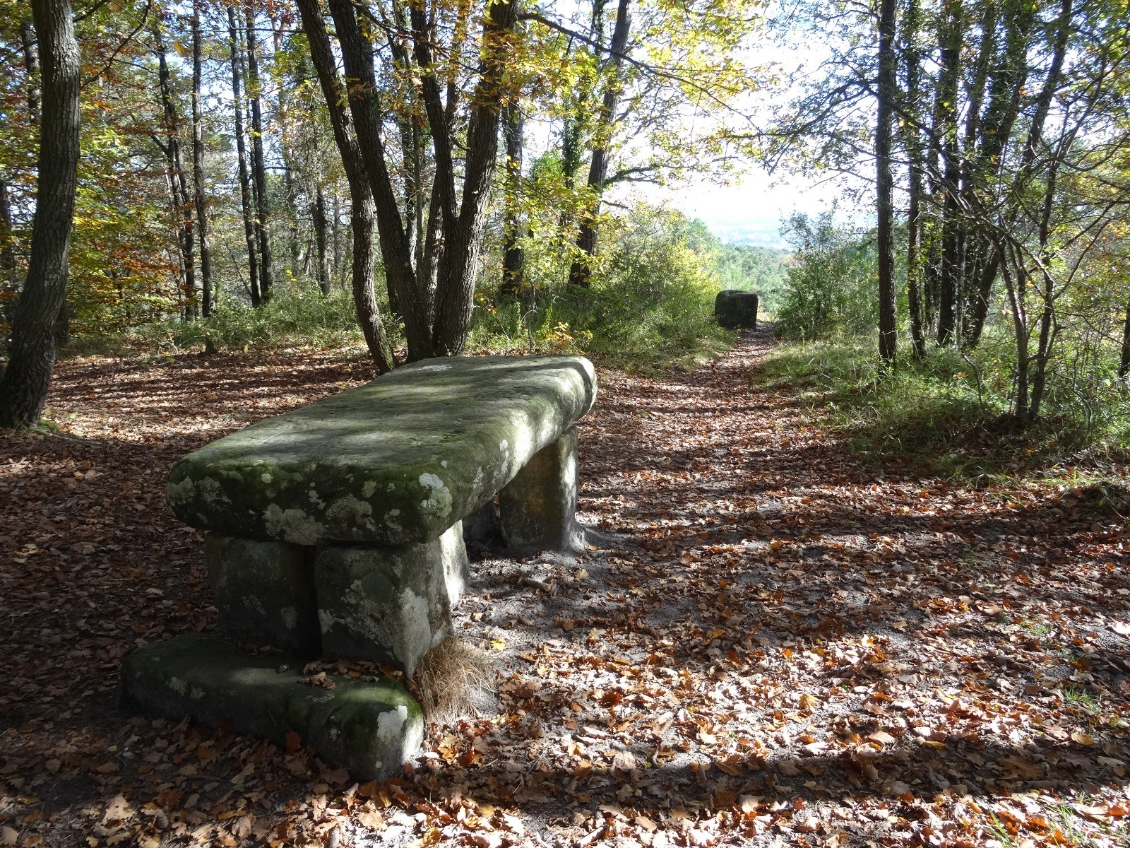 Au croissement, en bas par un aller et retour hors-piste, retrouver l’endroit ou Trouillebert * à poser son chevalet (voir image), au retour prendre à gauche l’allée des Châtons et retrouver le parking.