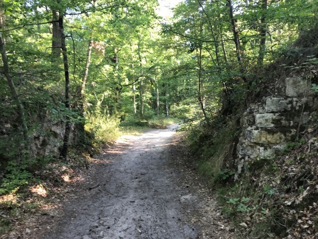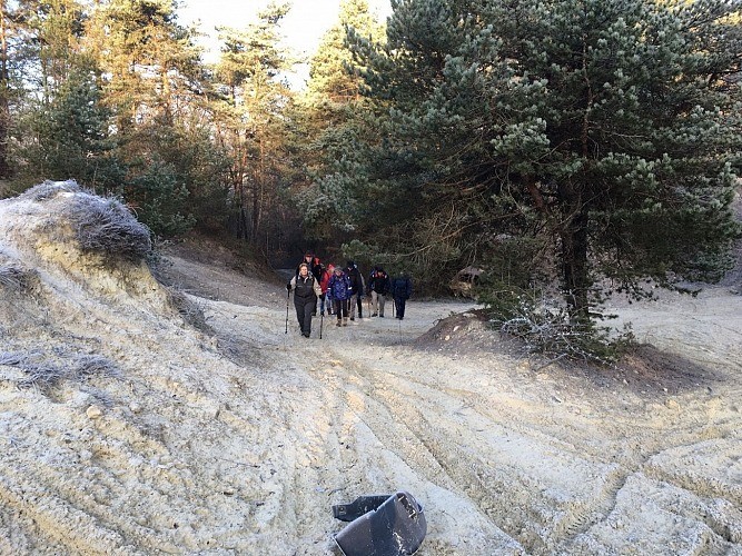 avant d’atteindre le haut, sur la droite une trouée mène au front de taille, l’emprunter et la suivre lorsqu’il contourne ce front et rejoint une petite sente, qui va descendre. Sur la droite un escalier de grès dît « La Guette » et qui arrive sur la route de la Gravine, poursuivre à gauche pour la route de Varsovie et grimper. En haut par un aller et retour à droite pour observer la grotte du Croc Marin *, continuer la route et prendre sur la gauche la route de la Grande vallée.